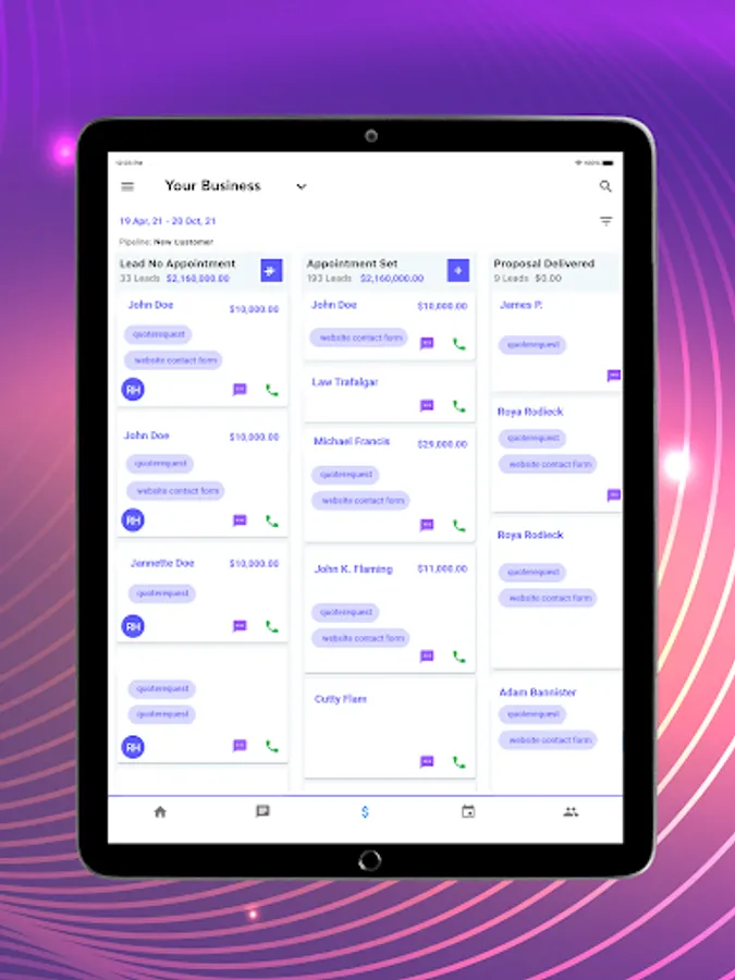 View, add and edit your contacts, pipelines and more with the quick actions menu. Respond to new leads questions, through SMS or call them directly within the app phone dialler or from the contact menu.