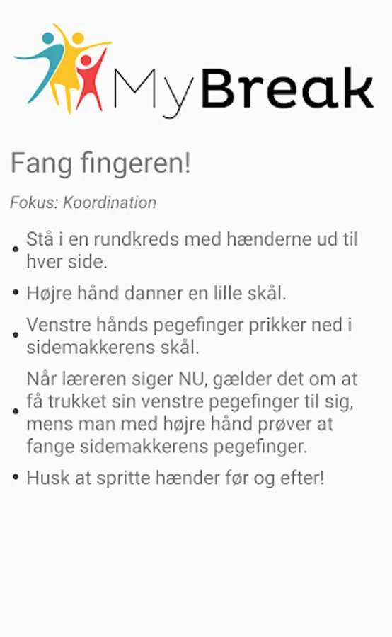 The Brain Breaks I send out through MyBreak will most often be activities that must be performed together with one or more, as I believe that through this you can strengthen the community in the class. For me, it is important that the small active breaks are also fun, and they should preferably give a smile on the lips.
