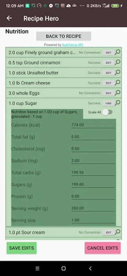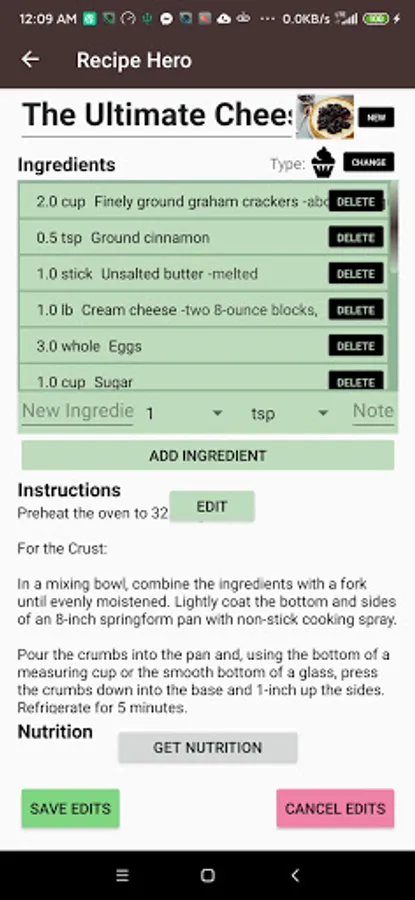 Use the Get Nutrition button automatically fetch nutrition for each recipe ingredient! You can tweak each individual ingredients nutrition to your liking or just lock your total recipe nutrition and set your summarized nutrition there!