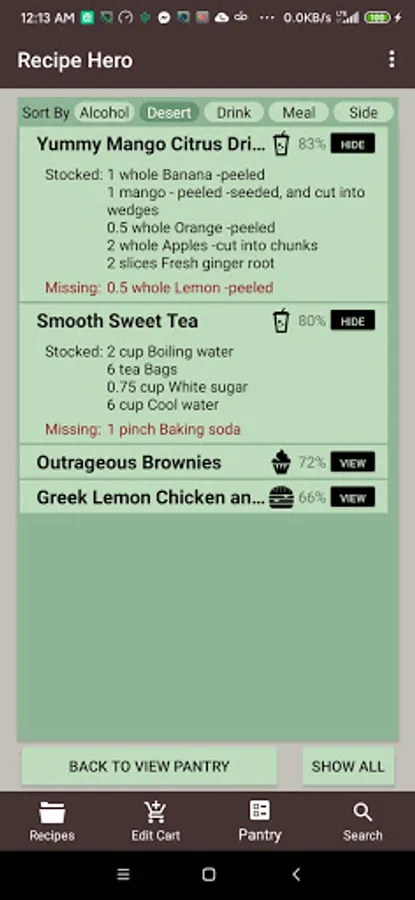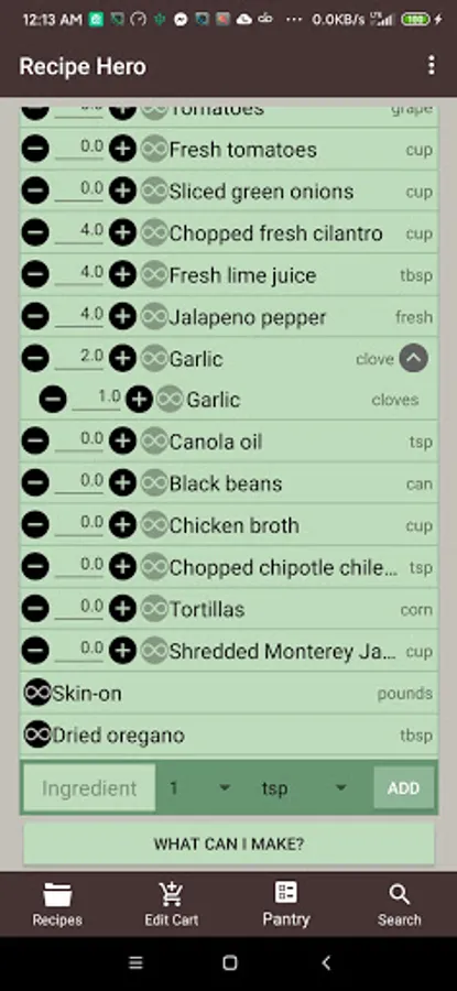 Press What Can I Make to see what you can make or are close to making. Quickly spot what ingredient you need to finish up a recipe or two!
