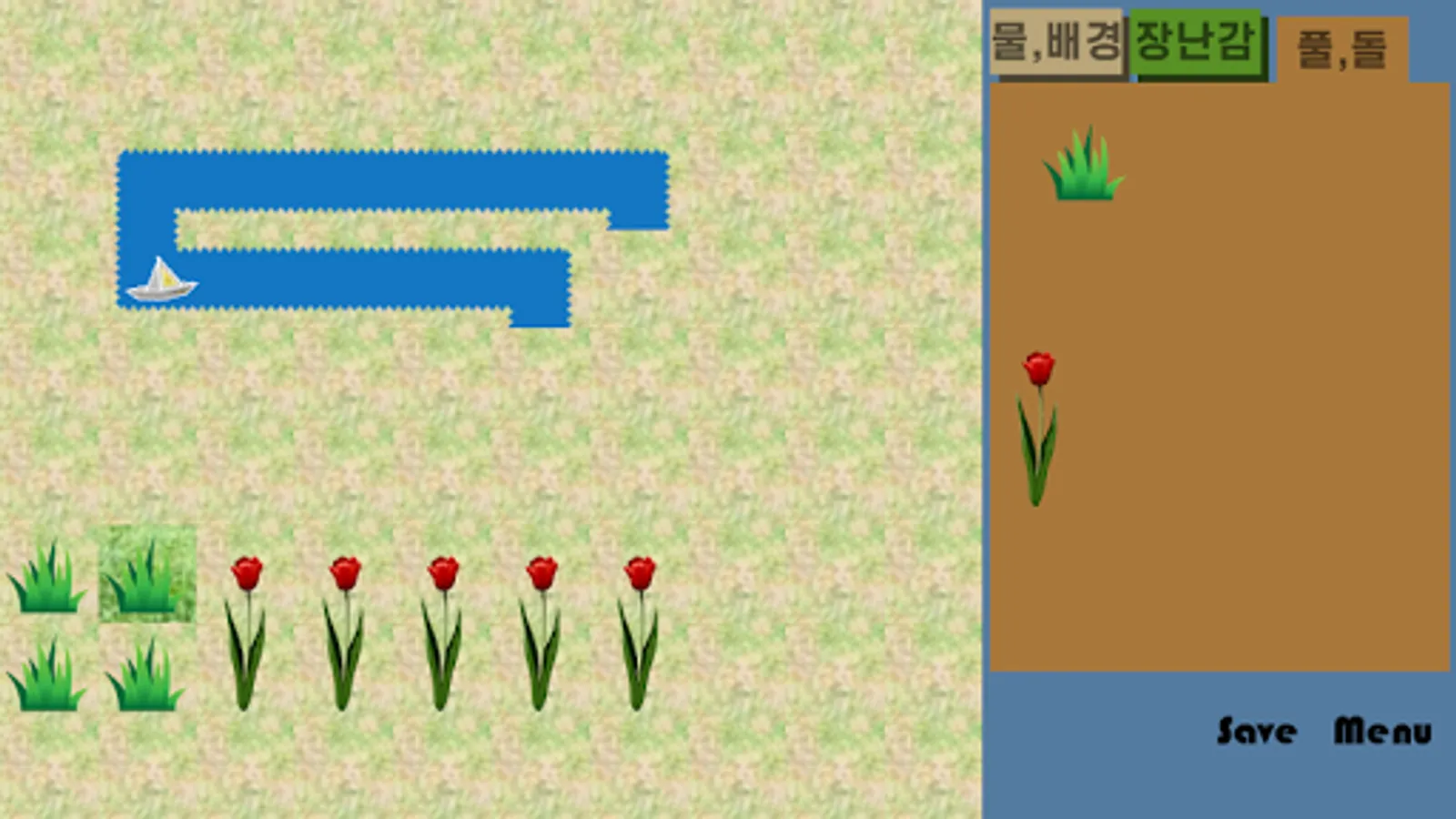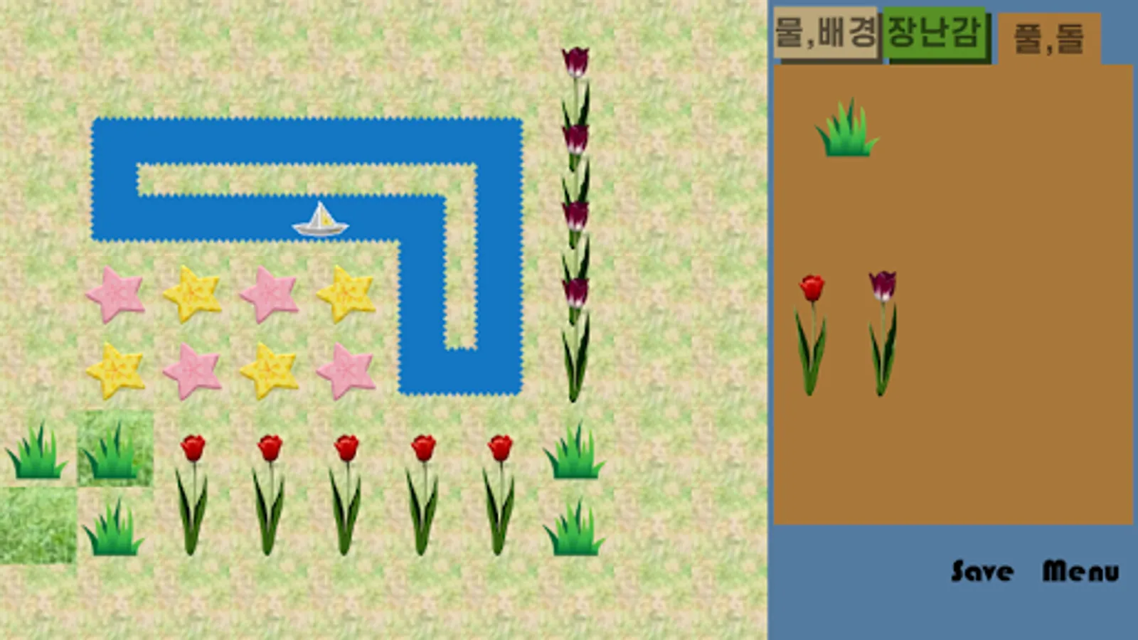 There are grasses, stones and flowers.