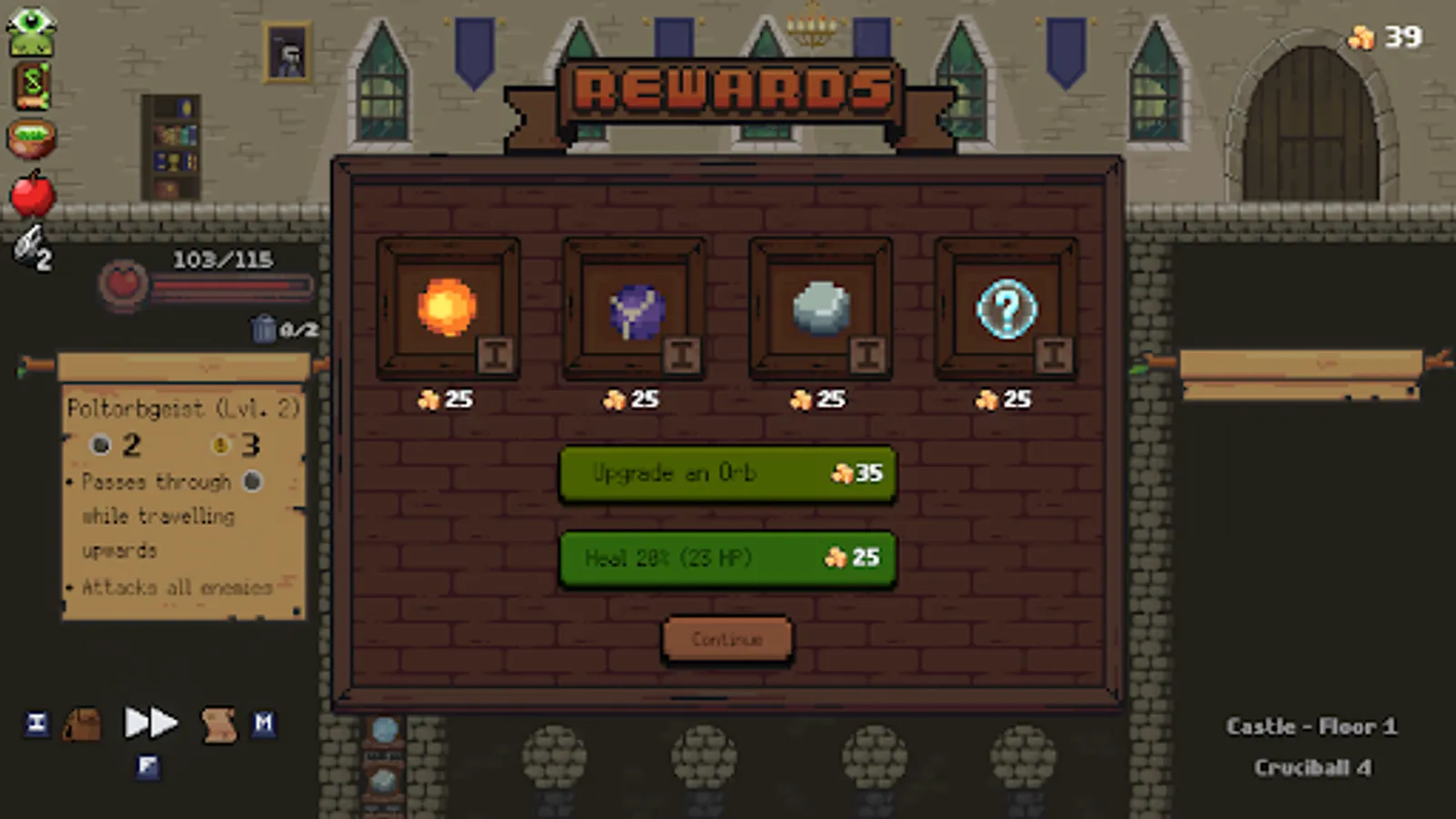 - Fight enemies with Pachinko-like gameplay - hit more pegs to do more damage. Use crit potions, refresh potions, and bombs wisely.