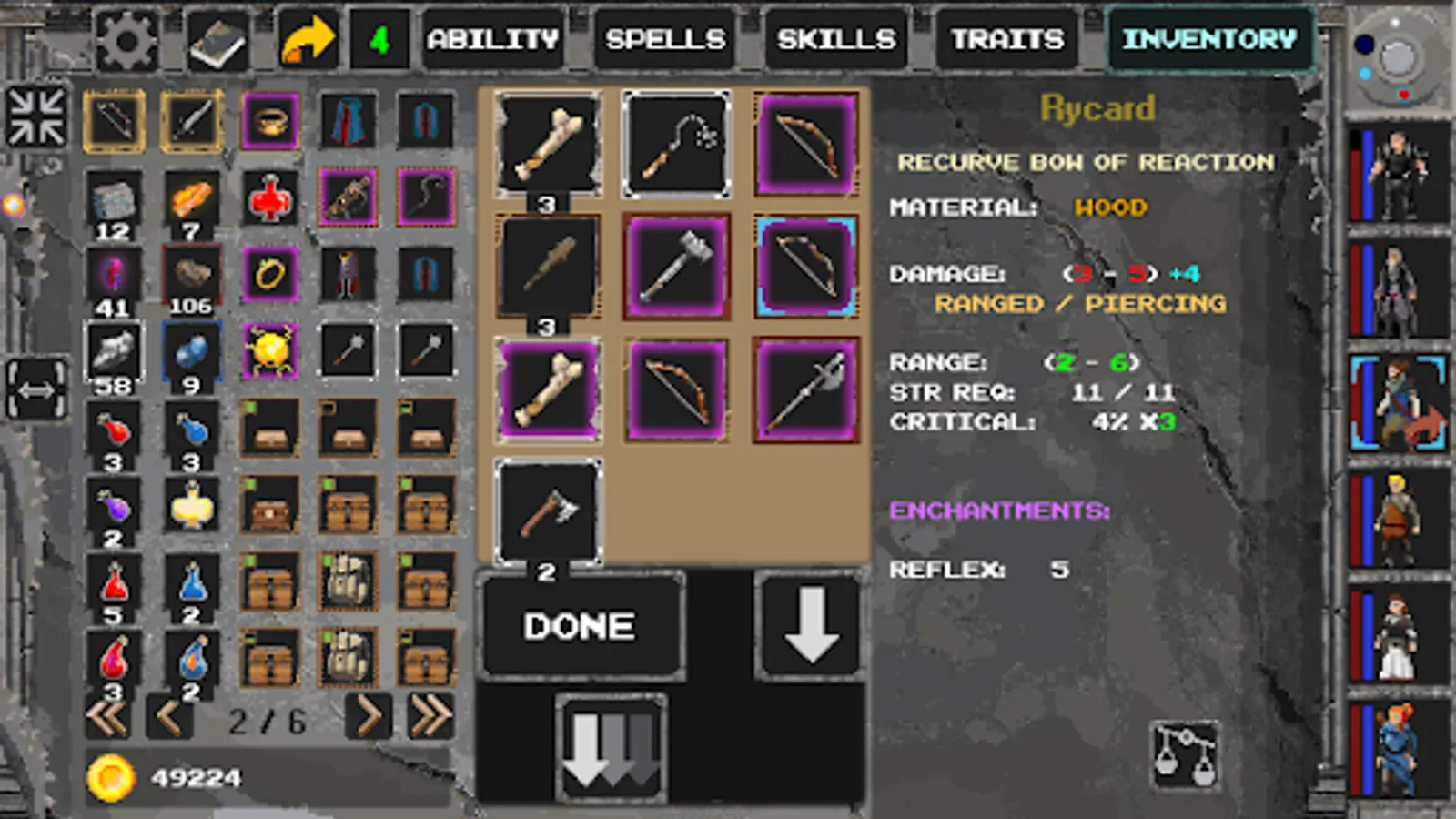 6 character capacity party, 65+ spells, 65+ abilities, 65+ traits, 50+ monsters, 40+ NPCs , 30+ quests, and 20+ areas to explore. Hundreds of items and tens of thousands of enchantment combinations make for all manner of powerful items.