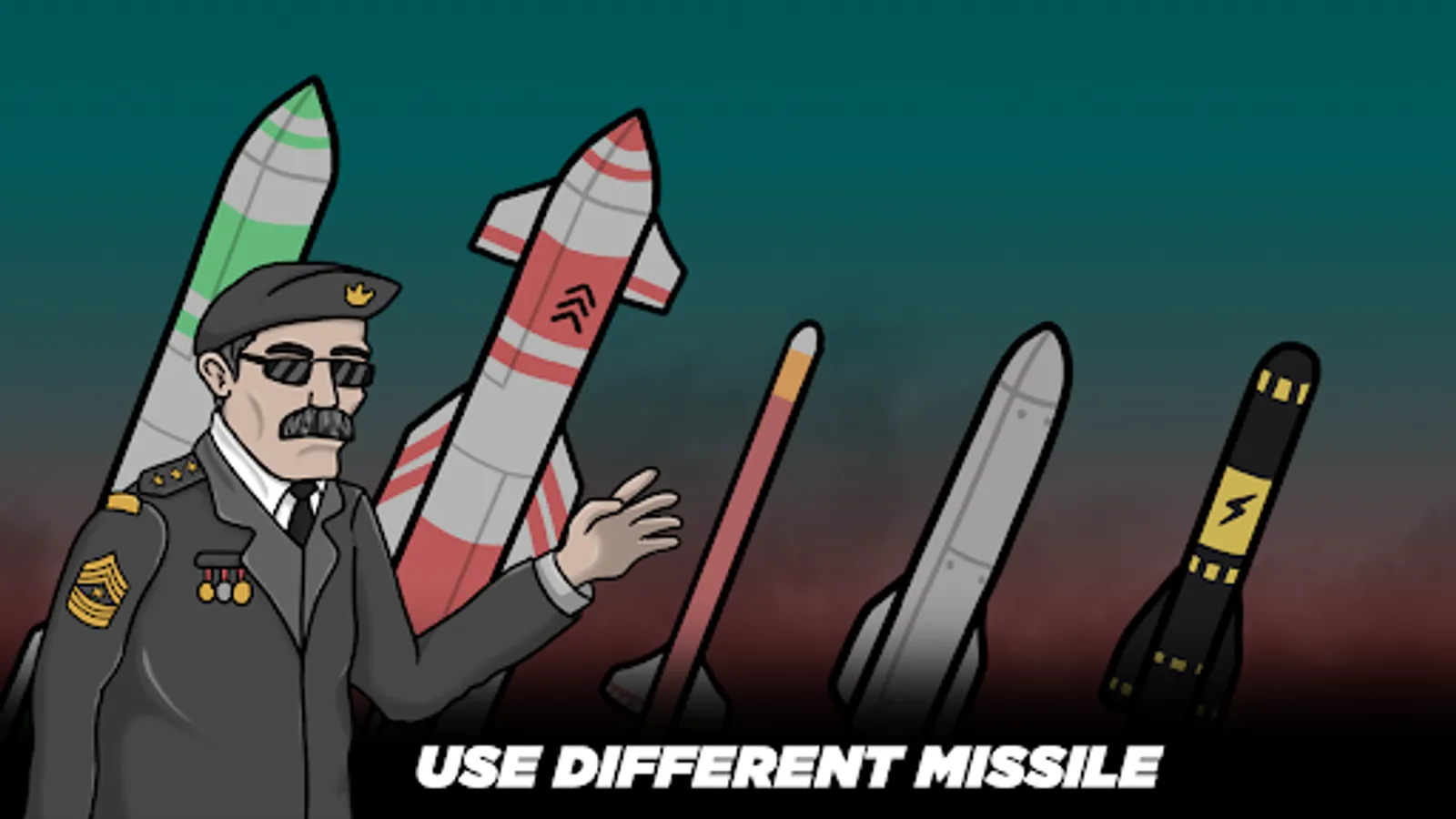 -There are various type of missiles which are available after a certain score and each missiles have different speed and blast radius.