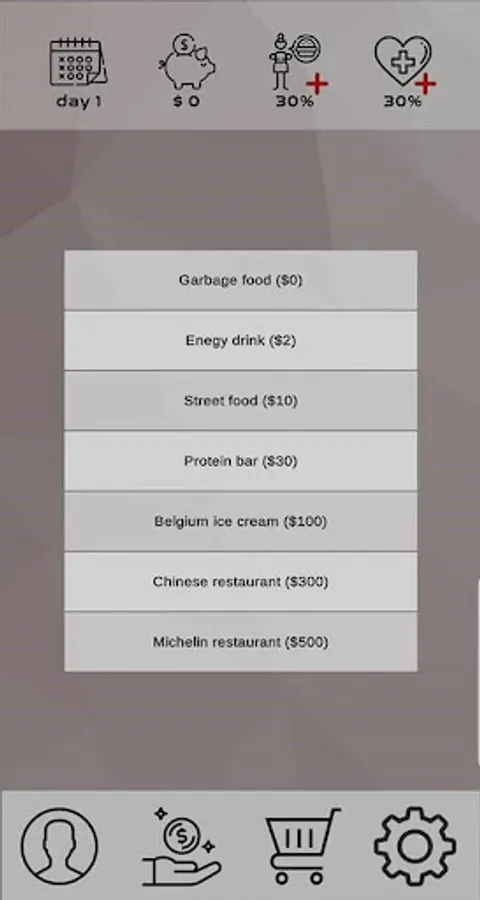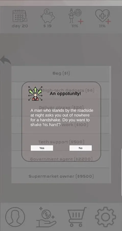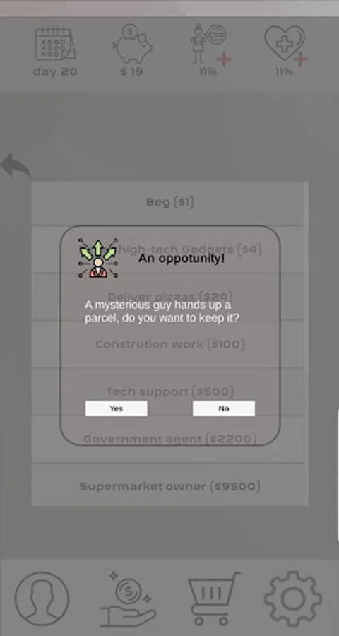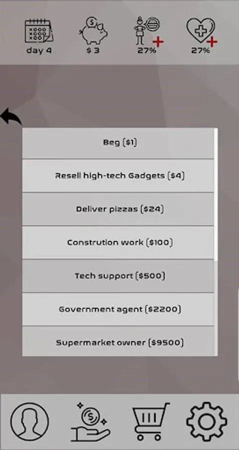 Earn money while making sure you don't die (keep life and hunger above 0%), buy transportation or lodging to unlock jobs with higher profits and have fun!