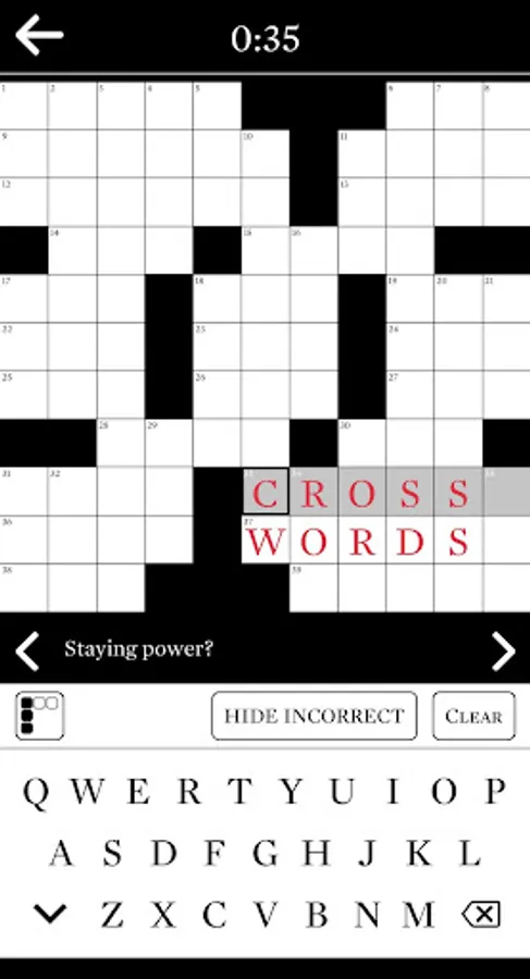 The goal of solving the puzzle is to write different words, letter-by-letter, in the white squares. Next to the grid is a list of clues. The answer to each clue is a word or sometimes a phrase.