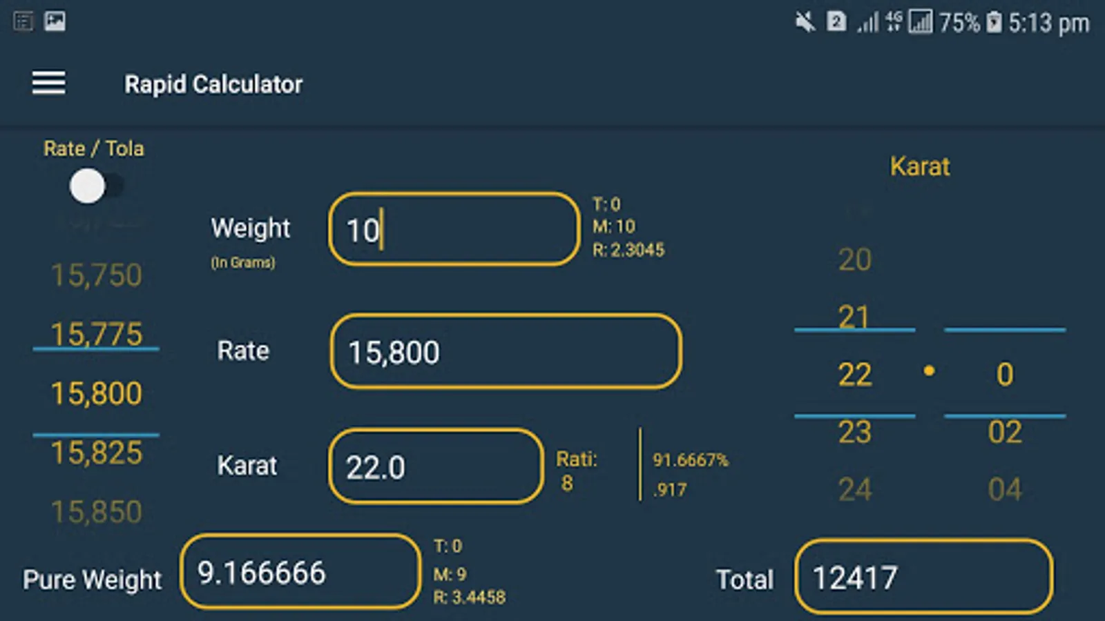 What you need to do is to open the calculator supply Weight in Grams, slide Rate and Karat sliders to select Gold Rate and Karat to be applied on calculation. And it will start showing you end calculation result Net Weight and Total price in the bottom. More importantly you can select default intervals and (rate / gram) and (rate / Tola) which you can choose from application menus.