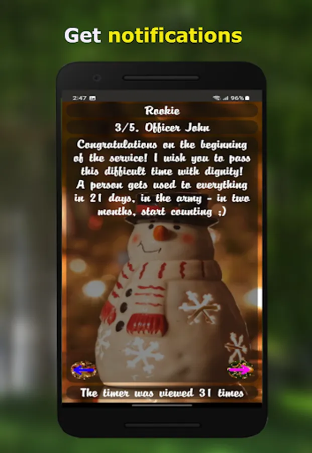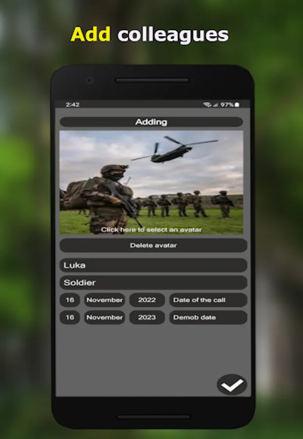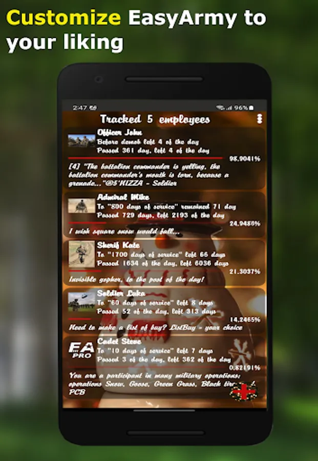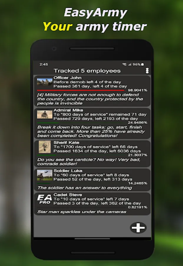Tired of constantly switching the timer to show a friend his service life? No problem! Easy Army keeps all information about each added soldier on one screen!