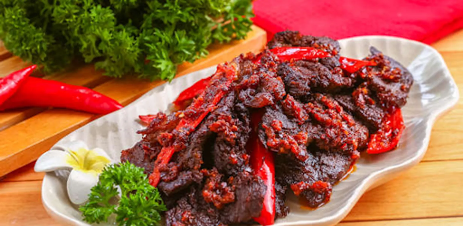 The first step is to prepare the beef and then thinly slice it. After that, fry until dry. The taste of Dendeng Balado tends to be less spicy because it uses large red chilies.