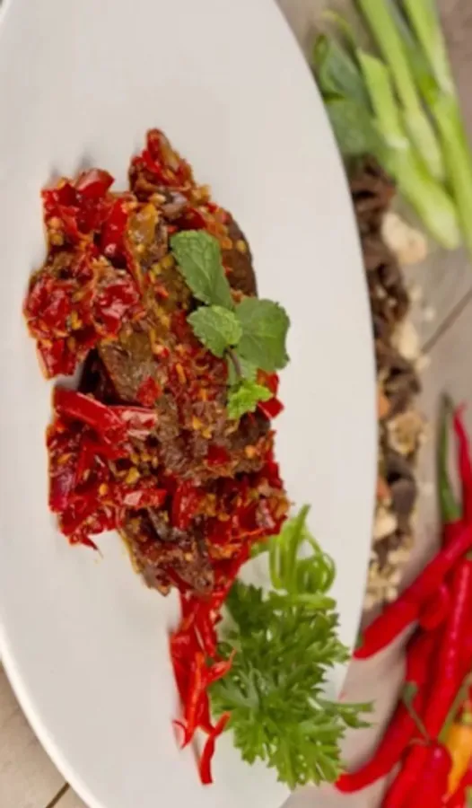 This jerky balado is half fried until it's still moist and juicy. The abundant chili seasoning makes it a bit spicy.