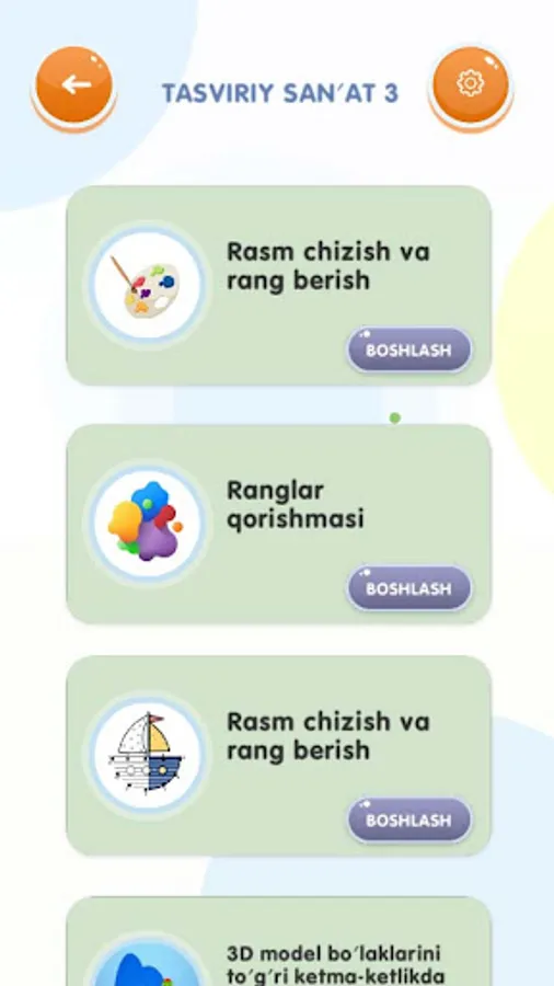 "Tasviriy san'at 3-sinf" ta'limiy o'yini 3-sinf Tasviriy san'at darsligi uchun qo'shimcha manba hisoblanib, mazkur ilovadan bilimlarni rivojlantirishda va baholashda foydalanish mumkin.