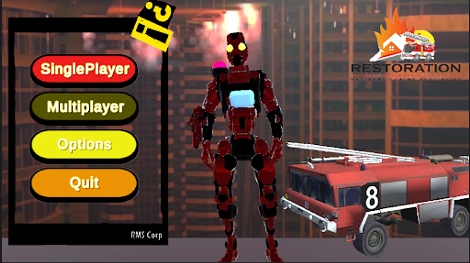 Restoration allows the player to on the role of Buddy a fire fighter who is a robot full equipped with tools to deal with huge city fires and bad robots that are there to destroy the city.