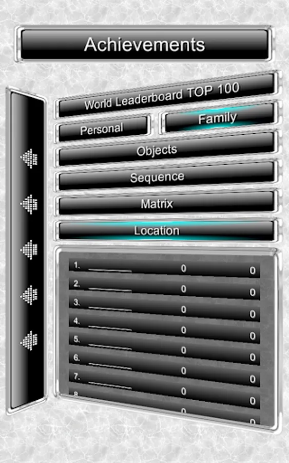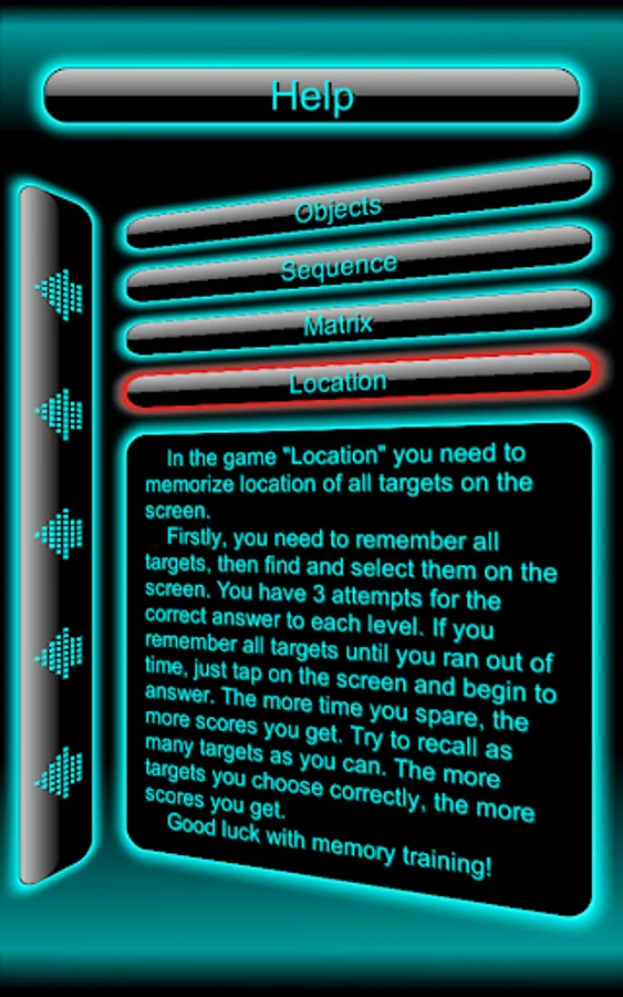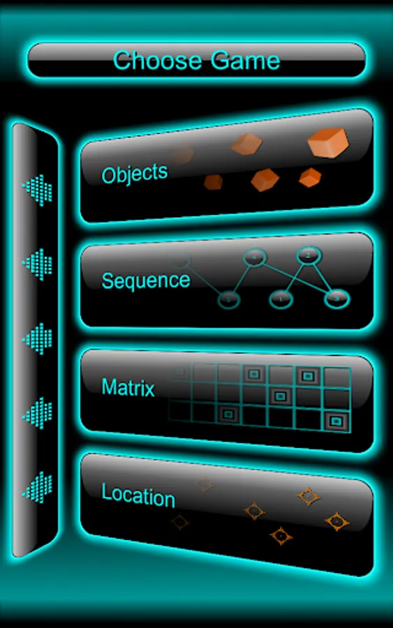 Family Memory Trainer has four games: Objects, Sequence, Matrix and Location. Each game trains different types of memory. In game Objects you need to memorize different objects. Game Objects is necessary for training of memorizing various objects, images, objects, things. In the game Sequence you need to memorize the buttons that appear one after the other. In the game Matrix you need to memorize all cells of given matrix. And in the game Location you need to memorize location of all targets on the screen.