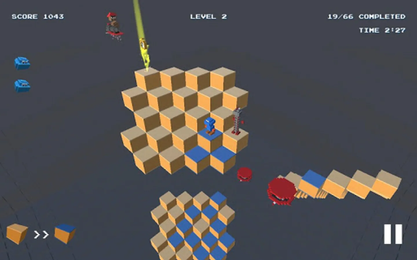 Meet Jumpy Cubester! A throwback to our favorite 80's arcade icon, just without the foul mouth. Jumpy Cubester is your kid friendly arcade game. A throwback to the retro arcade with 8 bit audio, retro style arcade play, and a cross between platform style games and puzzle games. Jumpy Cubester will have you jumping frantically to avoid enemy movement, collect power ups, and completing creative levels while competing against your friends highest scores.