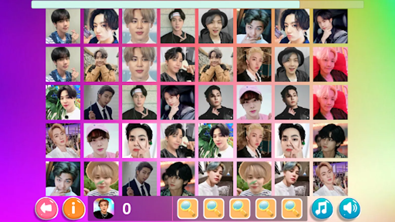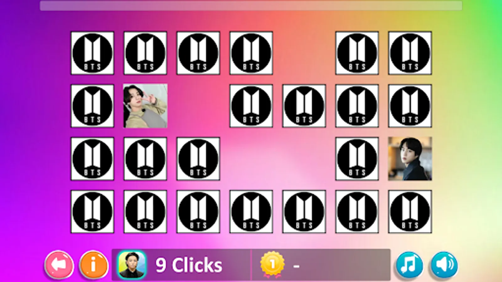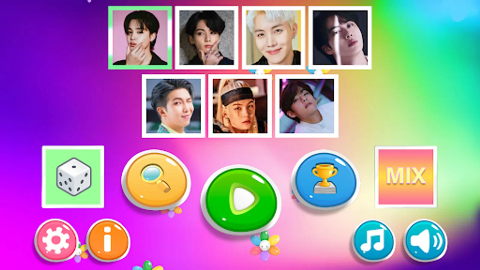 This game contains 7 thematic groups — «V», «J-Hope», «Jin», «RM», «Jimin», «Jungkook» and «Suga». You can pick any of them or shuffle cards from all these groups by pressing the "MIX" button. When in doubt, press the "Dice" button to randomly select a group for playing.