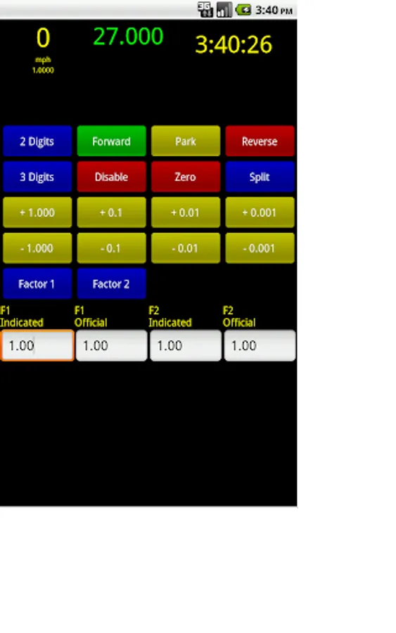 This app provides a high resolution GPS odometer and time of day clock suitable for road rally events. The odometer may be set to display miles or kilometers, the clock may be set to display seconds or cents. A correction factor for the odometer may be entered.