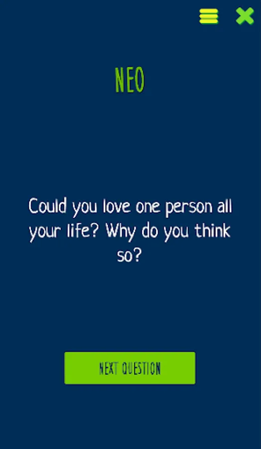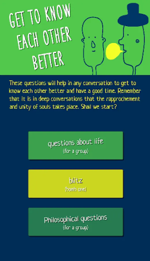 This app helps to know each other better and deeper. The questions are chosen in such a way to provide a topic for discussion. When the topic is not interesting for you, you can answer briefly and move on to the next one. If the question interests you, you can discuss this topic for hours.๐