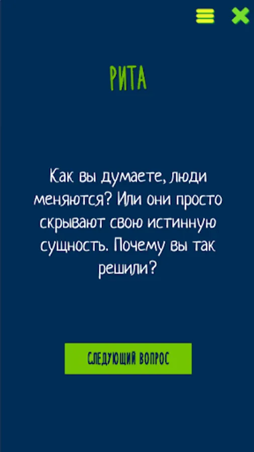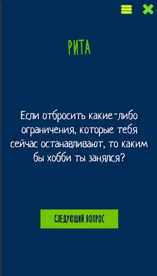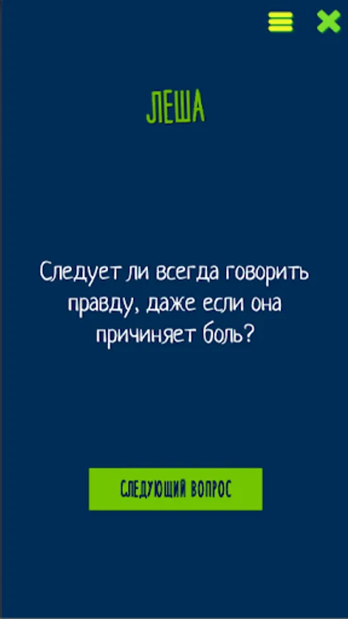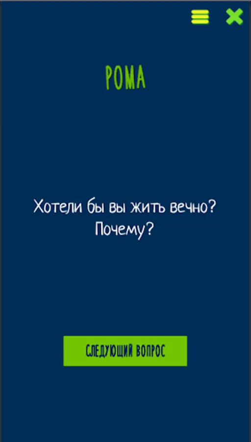 Если вы хотите узнать своего партнера получше, понять, что же движет вашими друзьями или просто повеселиться в кругу знакомых - это приложение как раз для вас! Вопросы подобраны таким образом, чтобы на них не просто люди отвечали, а включалась тема для обсуждения в разговор. Если эта тема вам не близка - можно просто ответить коротко и перейти к следующему, но если вопрос вас заинтересовал - можно часами обсуждать эту тему, забив на вопросы и приложение на долгое время. 🙂