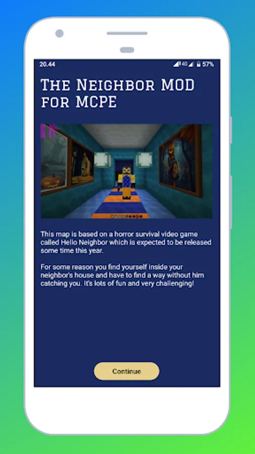 This app includes an installer for Map The Neighbor for MCPE which is a mod for MCPE. It is a game of terror and concealment, where your neighbor seems to hide something and you enter his house to discover it.