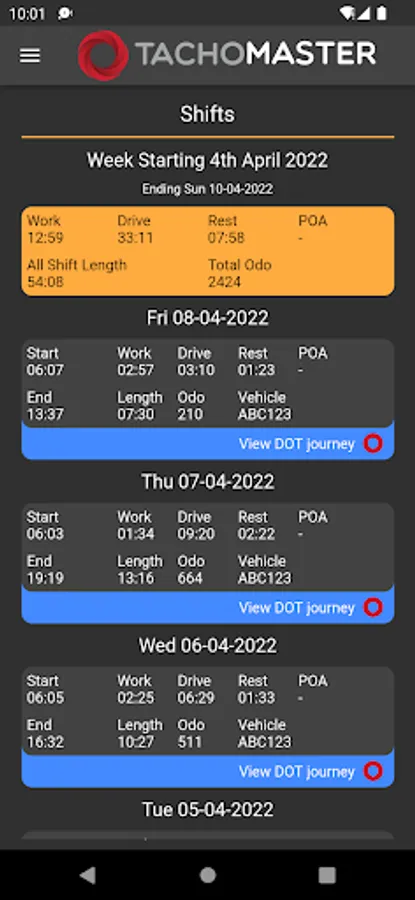 * View recent Shifts including Start time, duration, activity totals and vehicle