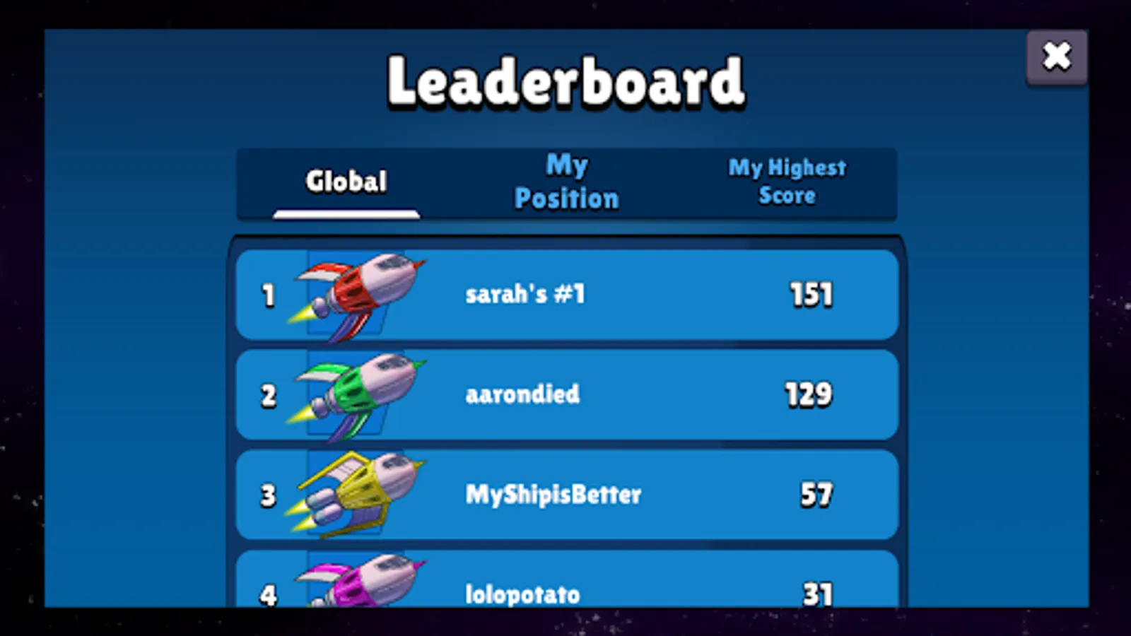 Get ready for an out-of-this-world adventure with Space-Hop! Inspired by classic arcade hits but set in fun and colorful space environment. In Space-Hop, you will navigate your ship through an endless galaxy, dodging obstacles and collecting new ships along the way. Compete with players from around the world on the leaderboard and see how far you can soar. With its fun and challenging gameplay, colorful graphics, and endless replayability, Space-Hop is a game you won't want to put down. Download now and start your space journey today!