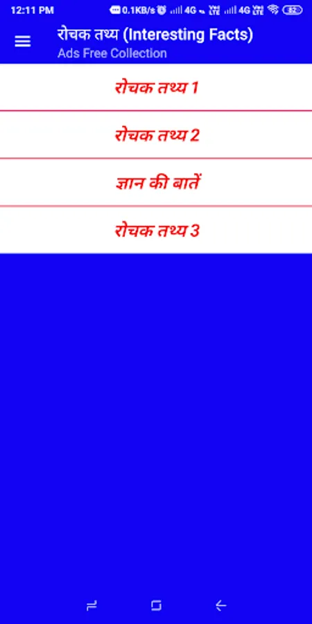 इसमें आपको पढ़ने को बहुत सारी Categories मिलेंगी | जैसे कि रोचक मनोवैज्ञानिक तथ्य,आँखों से जुड़े असामान्य तथ्य,भारत के बारे में आश्चर्यजनक तथ्य,दुनिया,प्यार से जुड़े,इतिहास,विज्ञान,दिमाग,मधुमक्खी,जानवरों से जुड़े,अंतरिक्ष,जापान,इंटरनेट आदि के अनसुने तथ्य.....