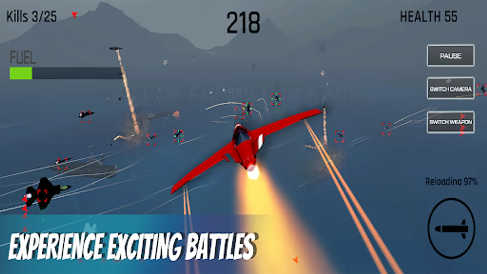 Fly in three Battle Fields for a Dog Fight in Day or Night modes.