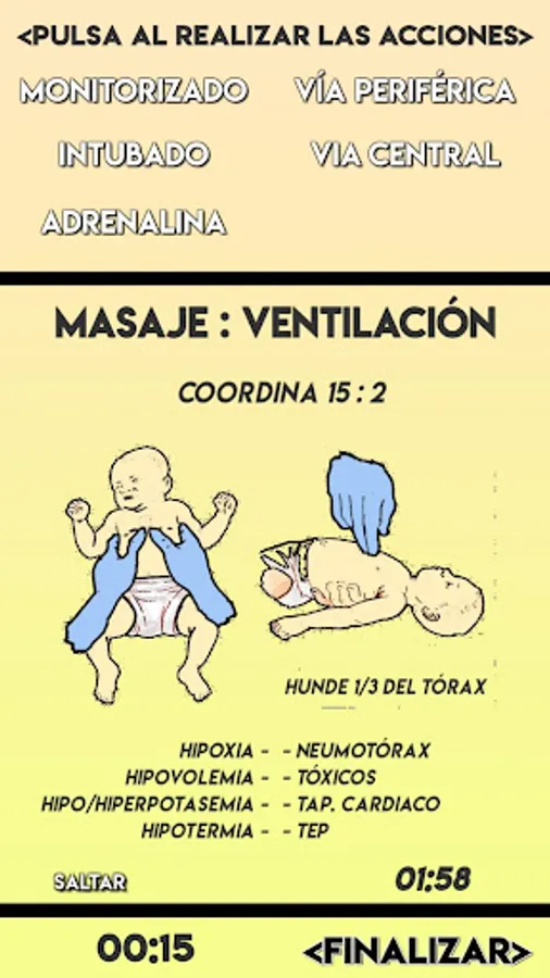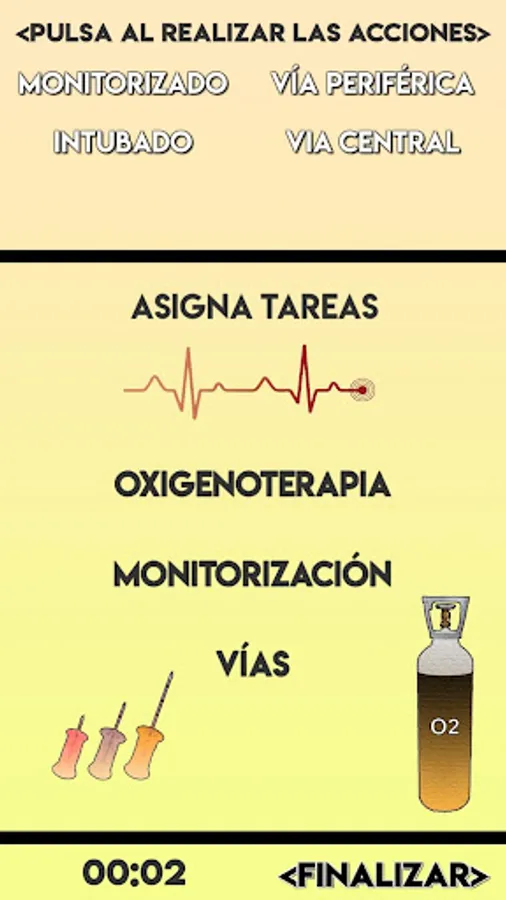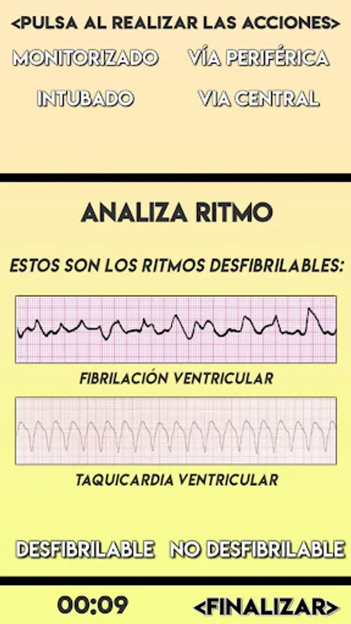 5. When the necessary conditions are met, the Adrenalina and Amiodarona actions will appear. In the case of these two actions, clicking on them will disappear, but reappear after 4 minutes to remind us that a new dose is necessary.