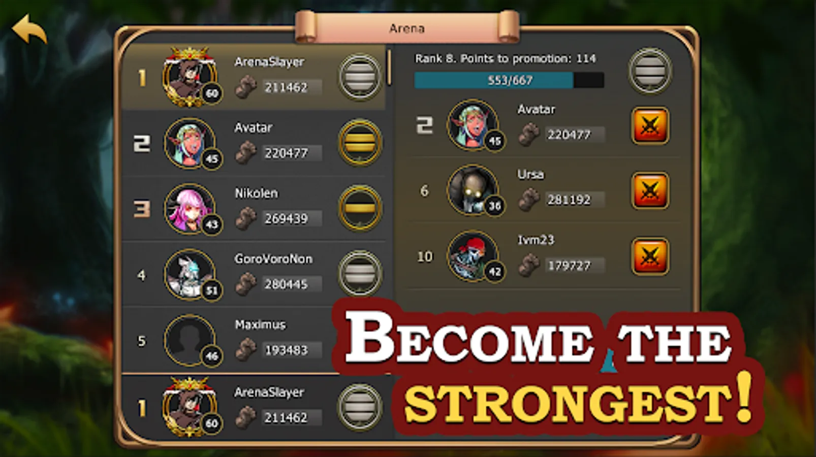 - Take a leading position in the ratings in a variety of areas. Fight in the arena, get the highest rank, and leave your competitors behind.