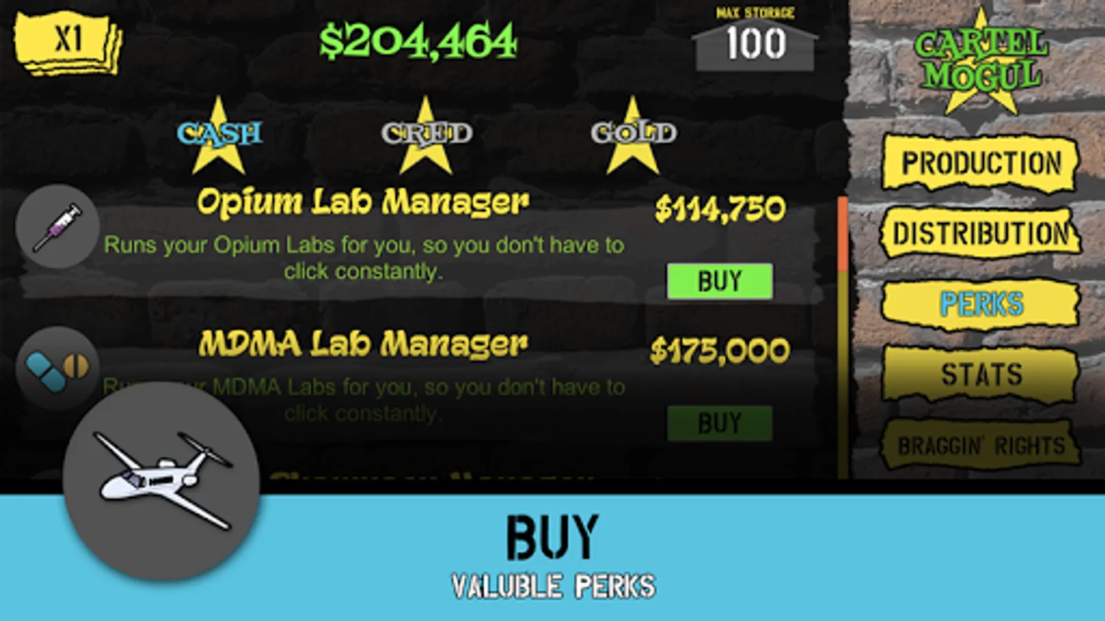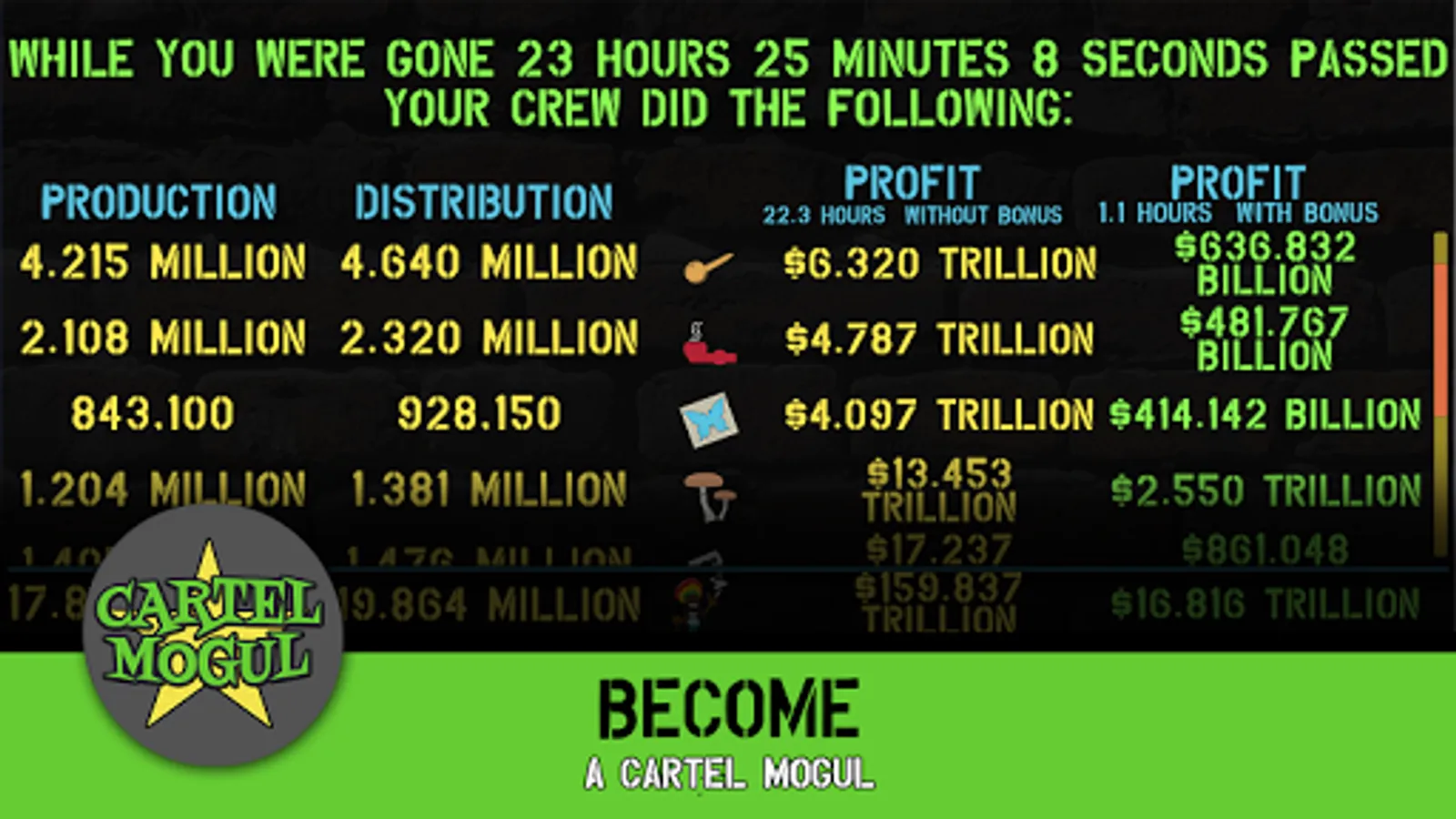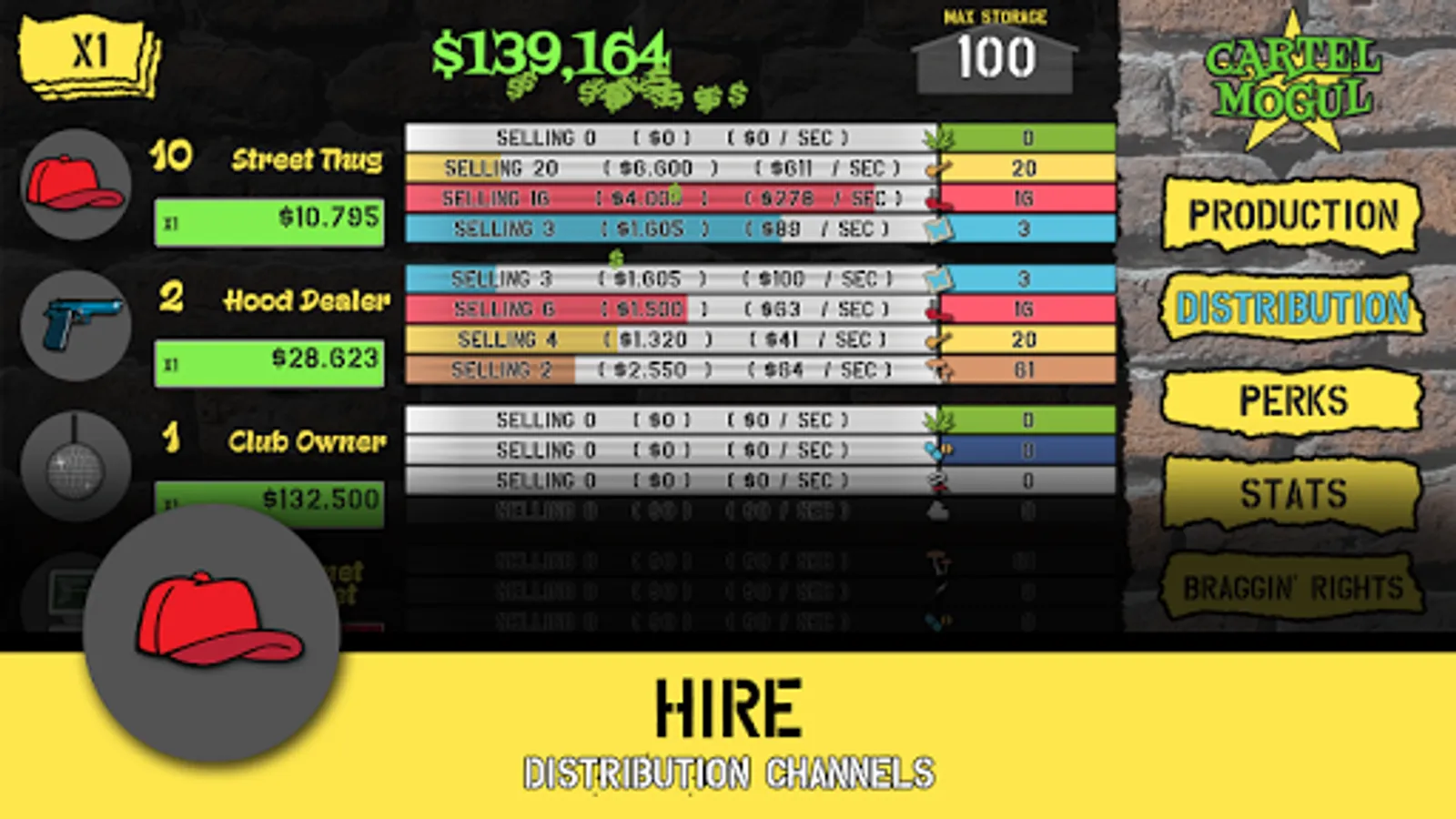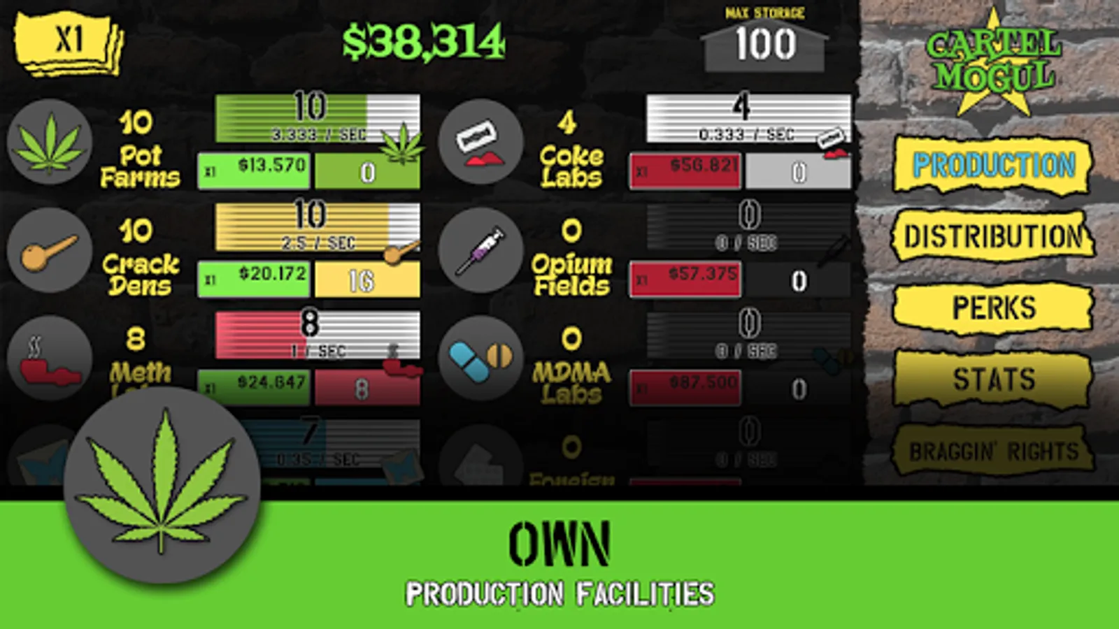 Build your Cartel by purchasing production facilities and build up an inventory of goods. Make your fortune by hiring drug dealers to sell your goods.