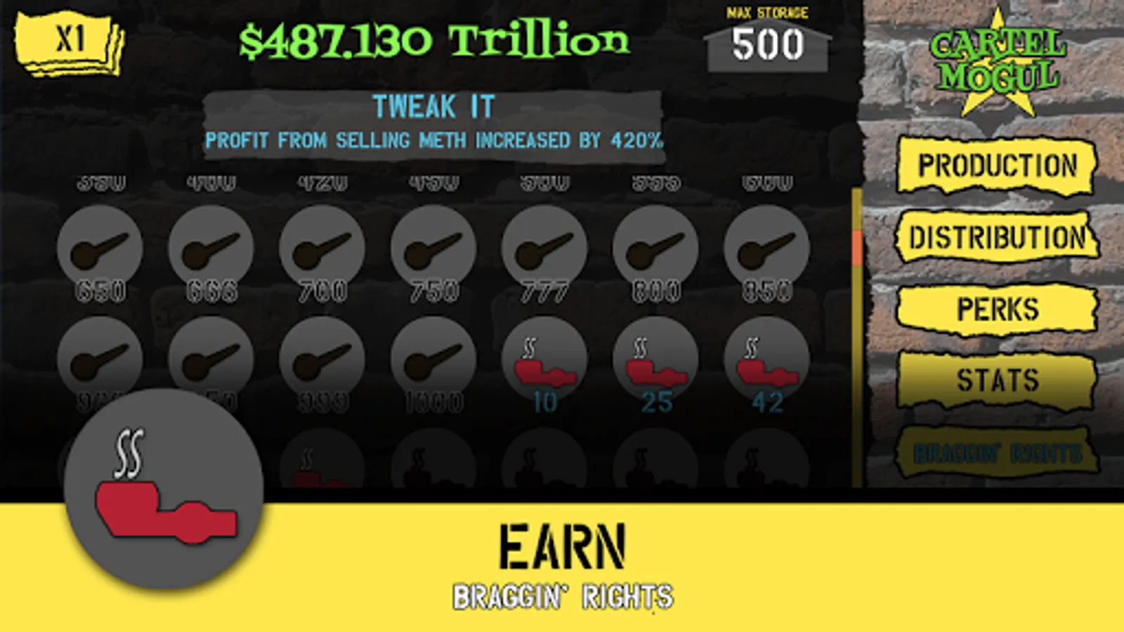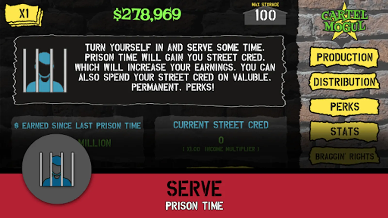 Start small, buying a Pot Farm and hiring a Street Thug to sell the pot. As your wealth increases you can purchase other types of production facilities and different types of dealers. Serving Prison Time will earn you Street Cred that can be used to purchase valuable bonuses. Prove that Escobar’s got nothing on you!