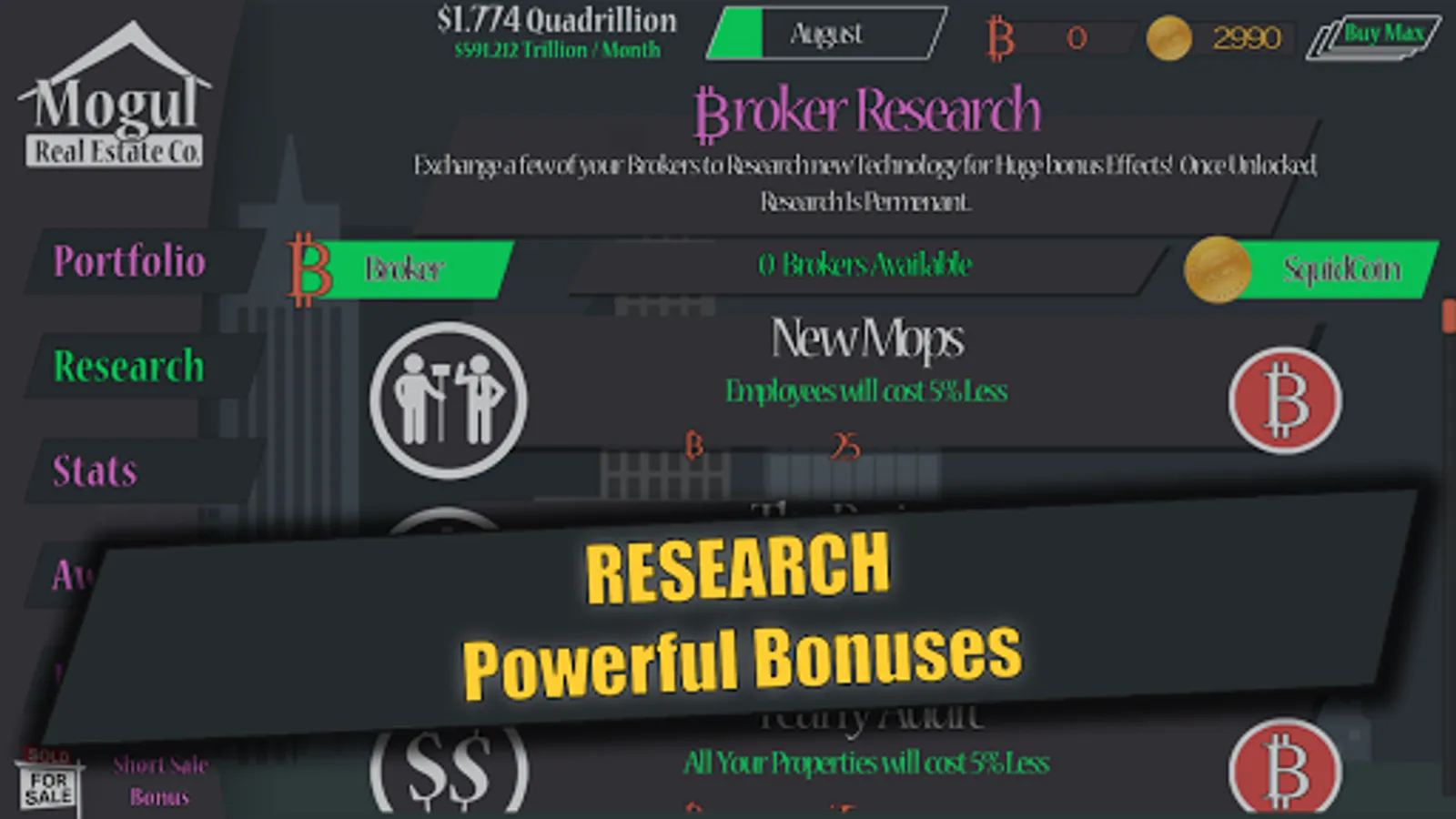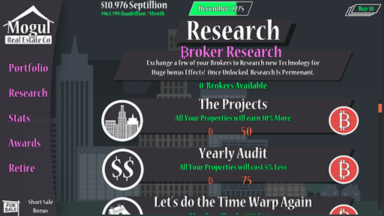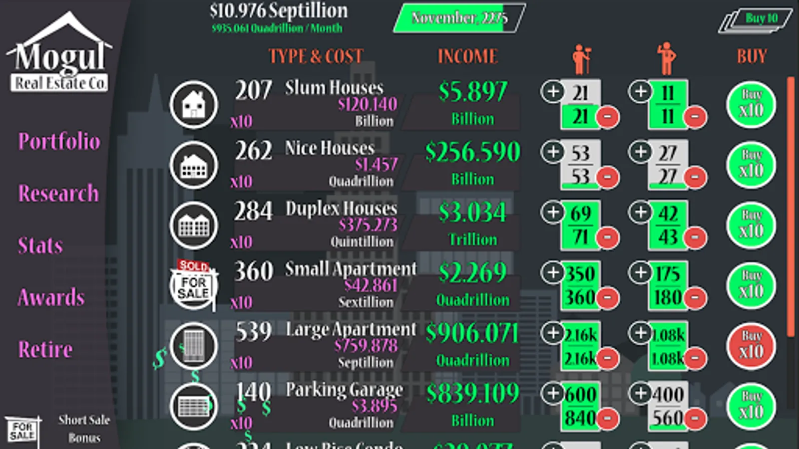 Start small, buying a few Slum Houses, wait a little while, and reinvest to buy better and better properties. After a while, retire to gain Brokers and use them for Huge Permanent Research Bonuses. Can you climb to the top and become the Real Estate Mogul?