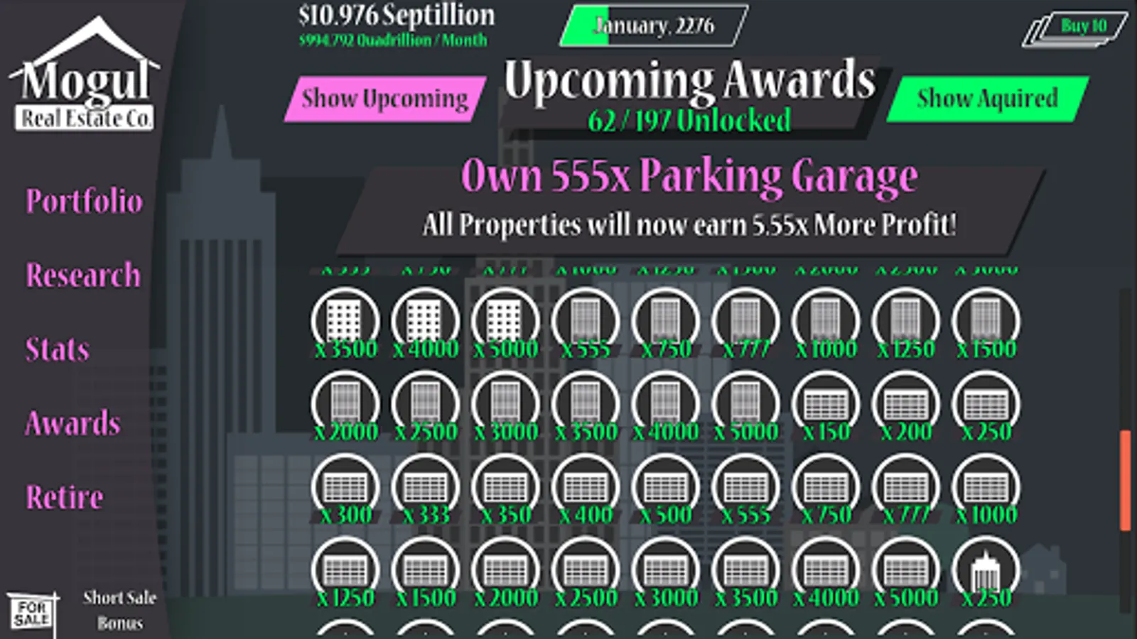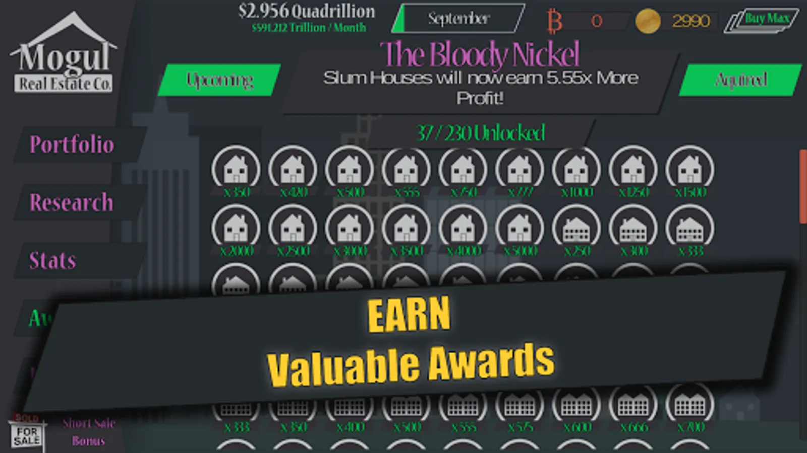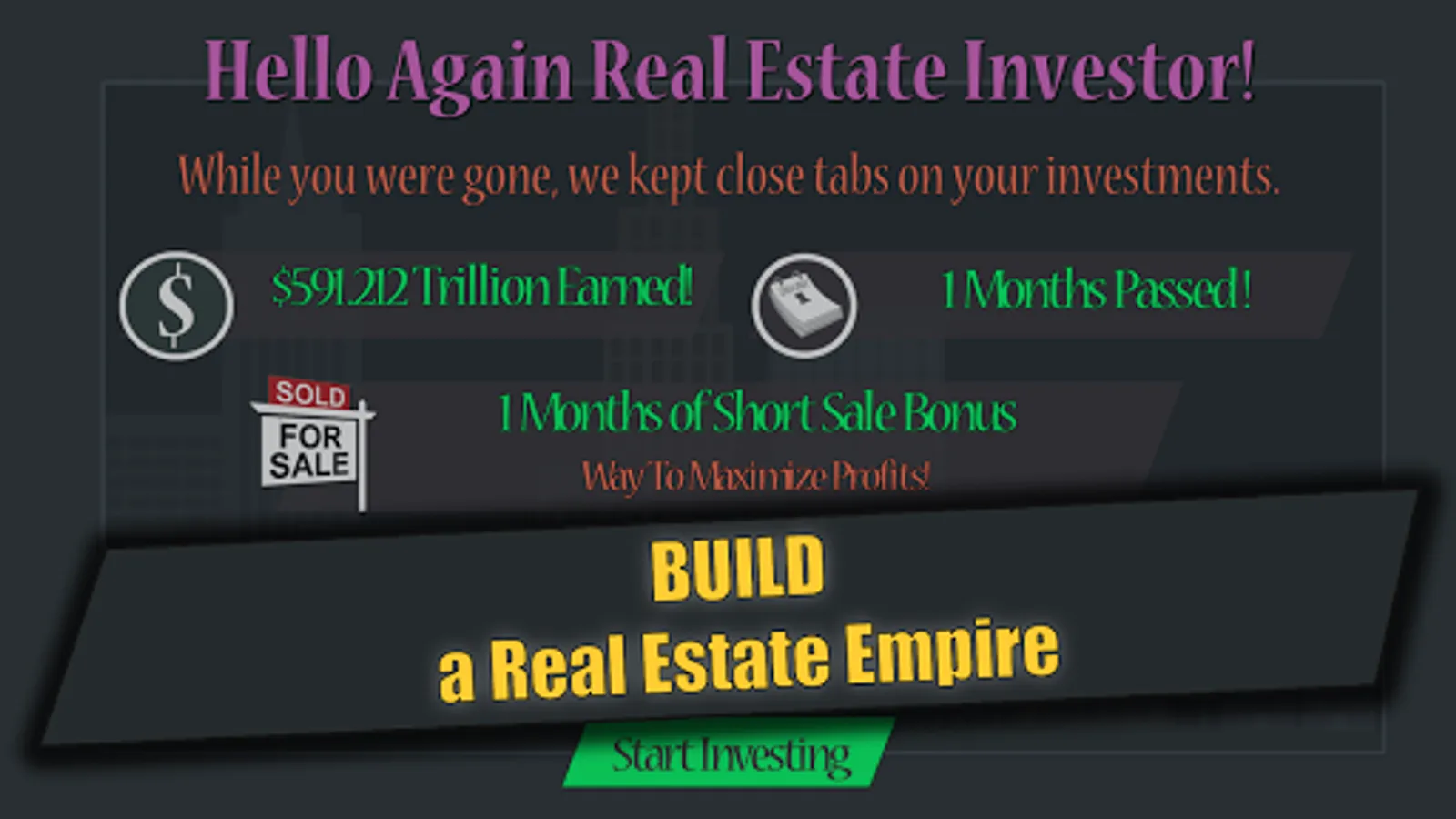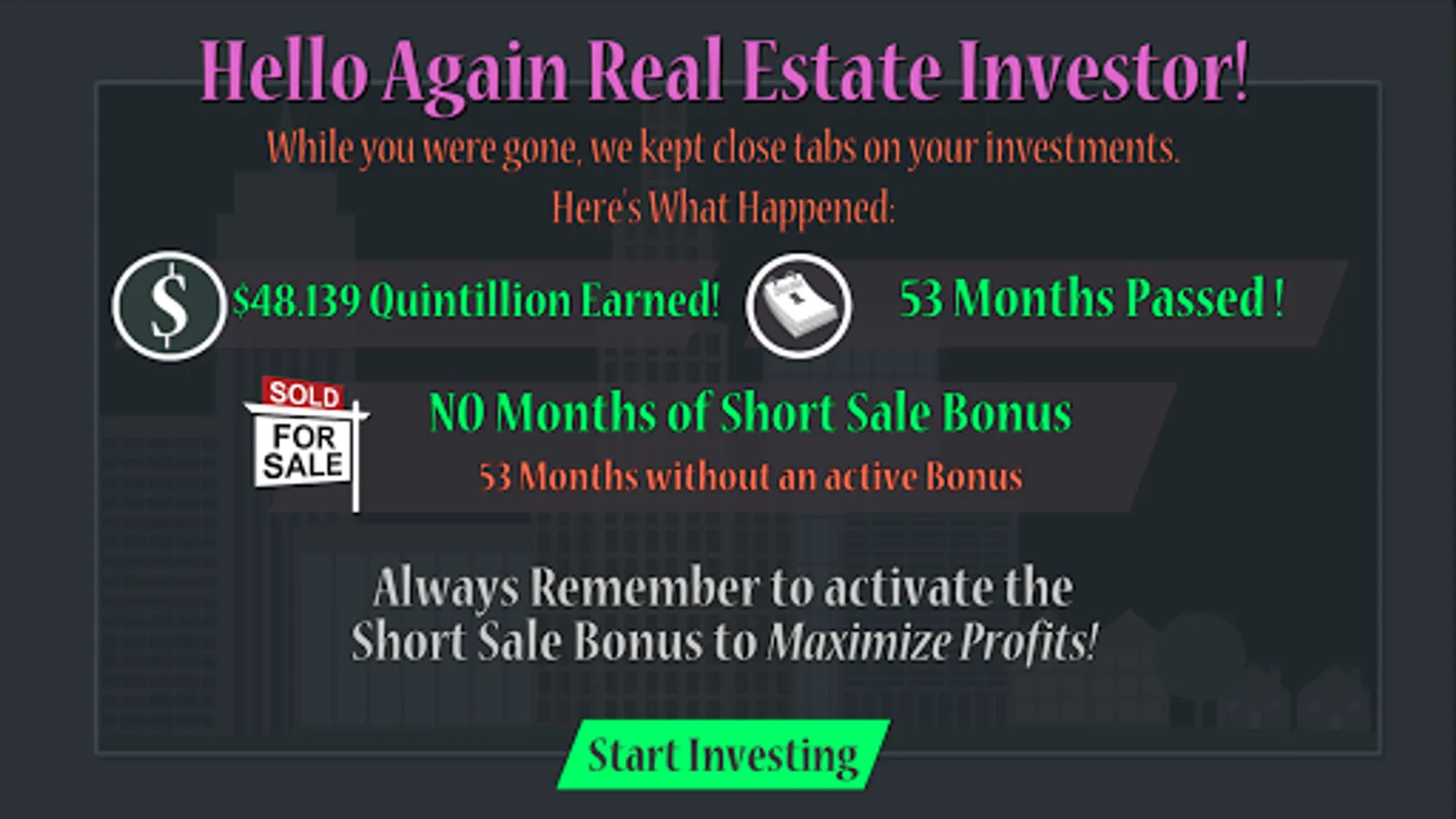 Start small, buying a few Slum Houses, wait a little while, and reinvest to buy better and better properties. After a while, retire to gain Brokers and use them for Huge Permanent Research Bonuses. Can you climb to the top and become the Real Estate Mogul?