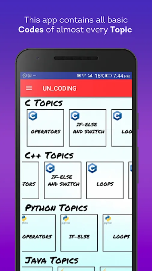 "Understanding coding" app is for those, who knows the syntax of coding but don't know where and when to use that syntax. Sometimes we need more practice to understand the coding. In this app, almost all the important topics of the programming languages (C, C++, Python and Java) have covered by us. Few codes are there for every topic of programming language which will help a coder to build logic for coding.