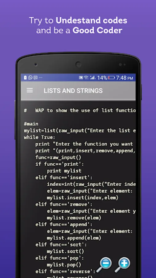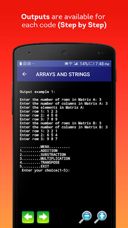 You can also zoom-in and zoom-out the code and the output according to the code or output length in your phone or tablet.