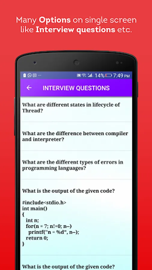 There is an option of interview questions in which we provide questions for your interviews. There are around 100 Interview Questions which also help you to explore more about the programming language.