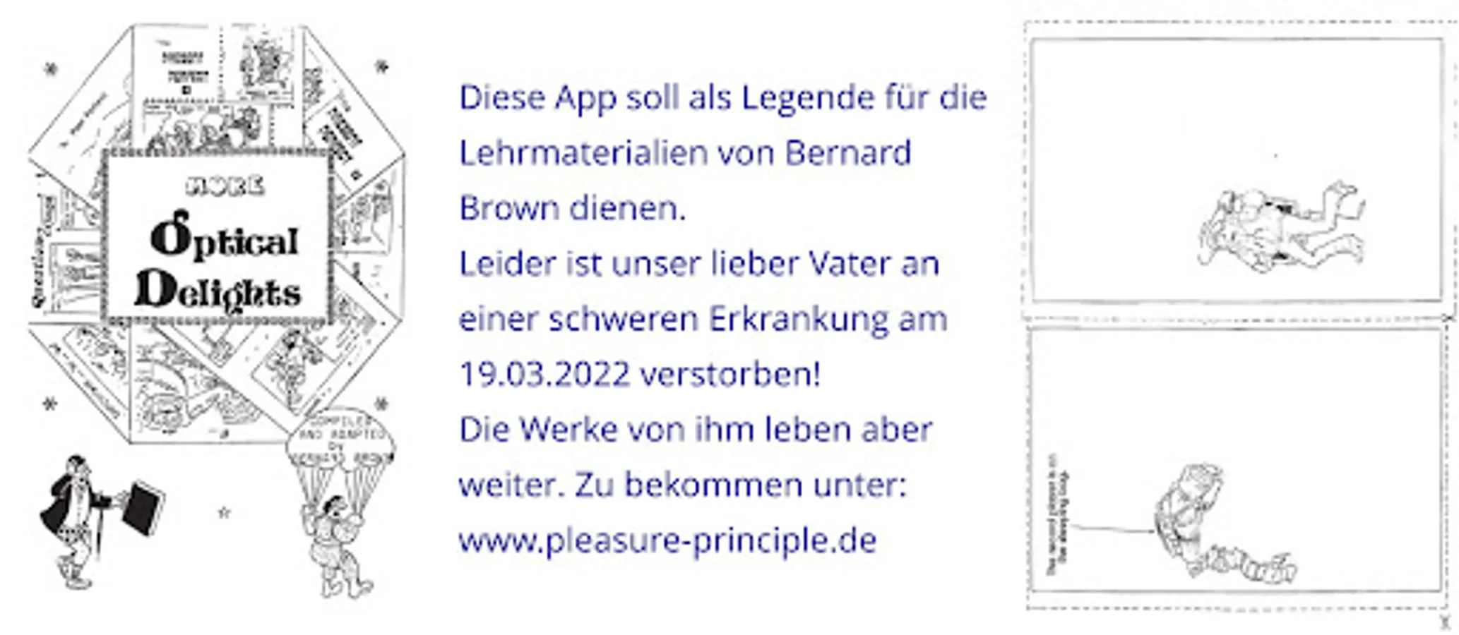 Unfortunately, it happened on March 19, 2022 after a serious illness: Bernard Brown unfortunately passed away. But his works live on, whether analogue or digital. This app only serves as an overview of what to expect from more optical delights. Some of these are still available in slide form or in digital format at: www.pleasure-principle.de