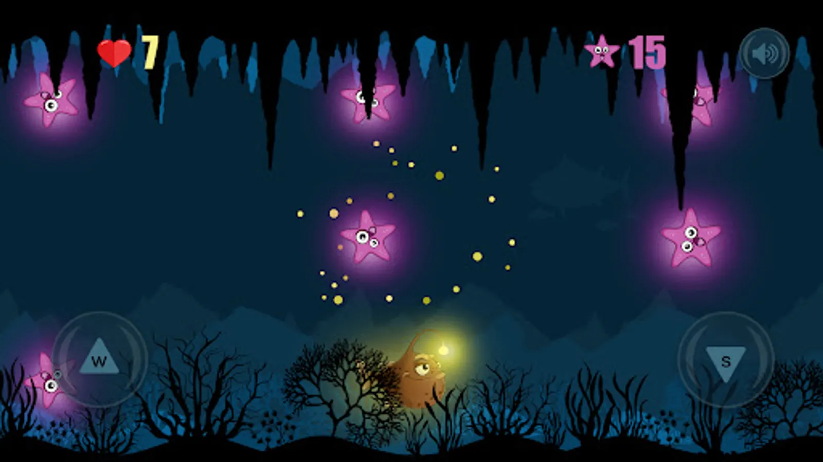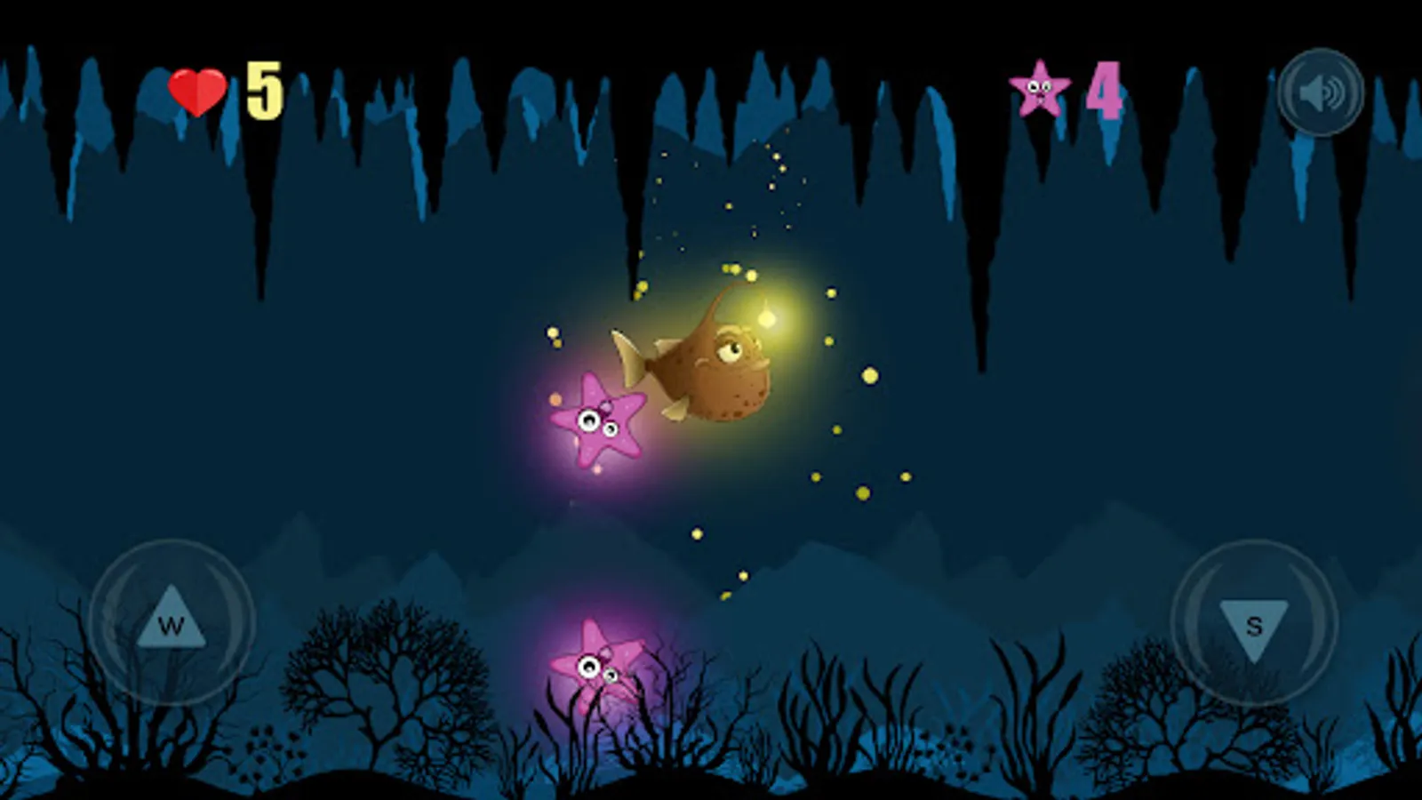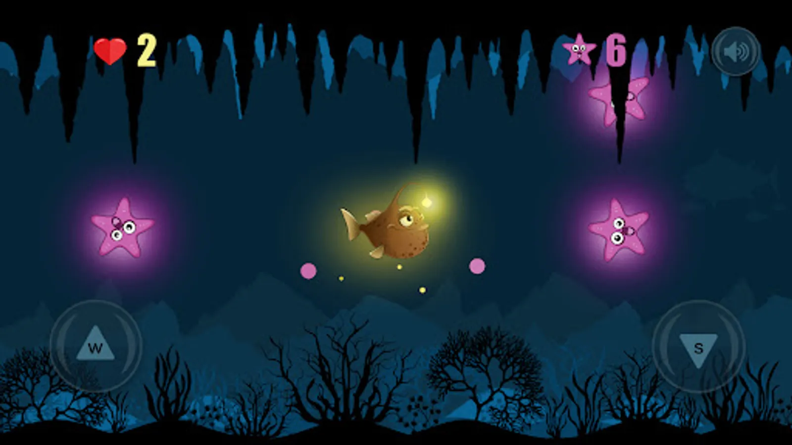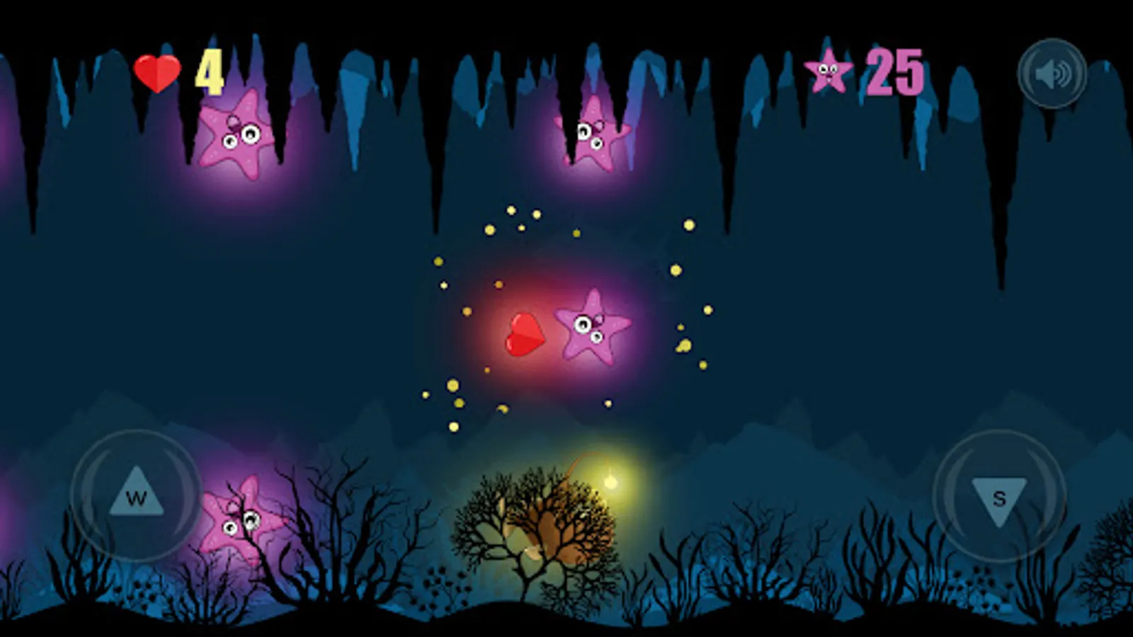 Beware of collisions with starfish, catch only floating hearts, they restore health and are taken away when colliding with stars.