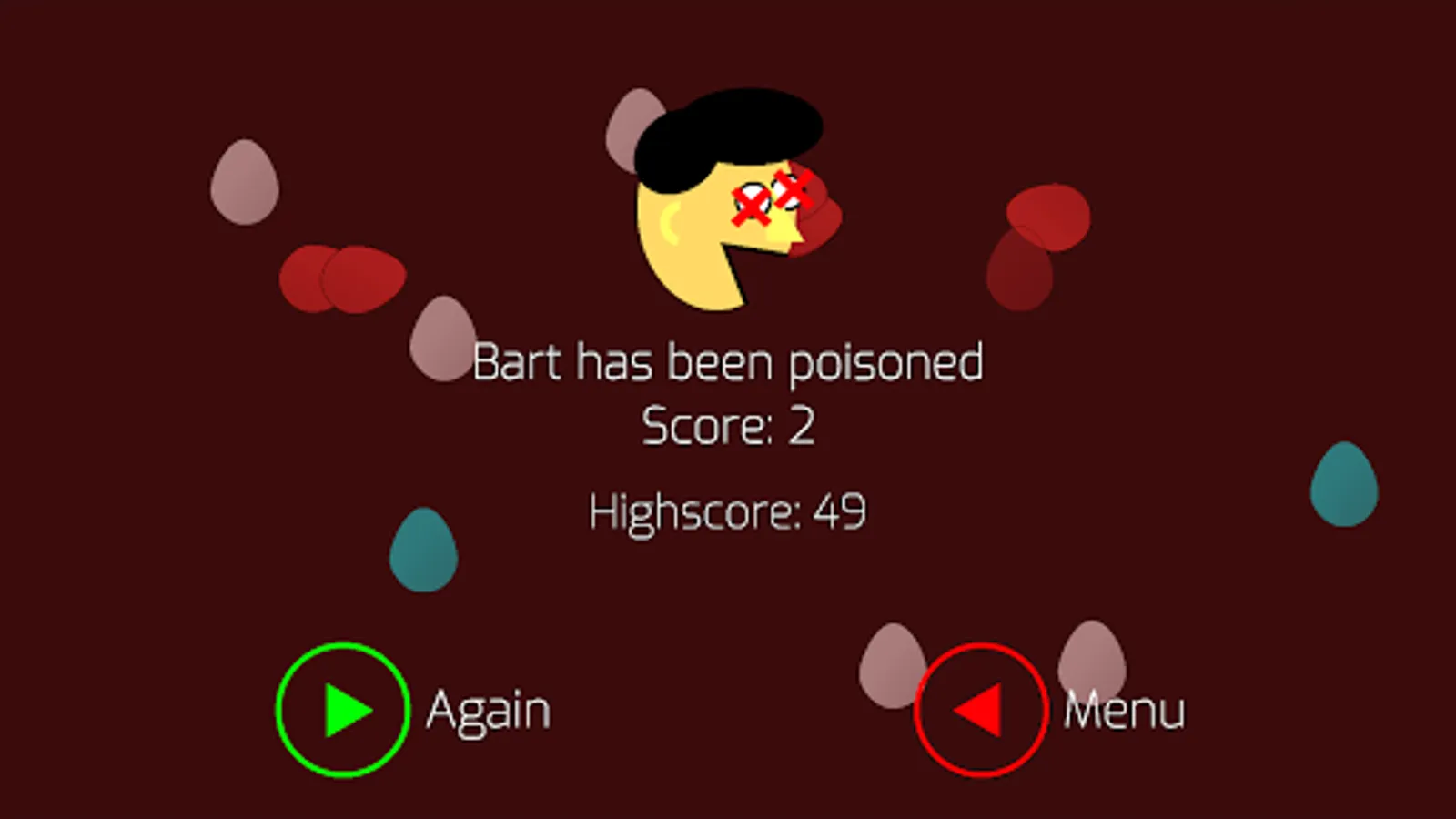In this game you control a fun character named Bart. The goal of the game is to eat as many white eggs, while avoiding red eggs. Sometimes, blue eggs and gold eggs can spawn to help you out. See how long you can keep Bart alive before he is poisoned by the red eggs, and try to claim a spot on our global leaderboard.