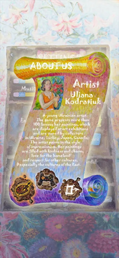 The main feature of this game is that all the graphics for it were developed by a young Ukrainian artist - Ulyana Kondratyuk👸🏻. The game presents more than 100 famous paintings of the artist, which are displayed at art exhibitions and are owned by collectors in Ukraine, Turkey, Japan, Canada, Egypt. The artist paints in the style of impressionism. Her paintings are filled with kindness and charm, love for the homeland and respect for other cultures, especially the cultures of the East.