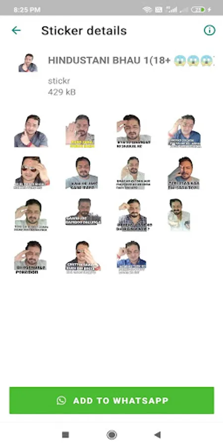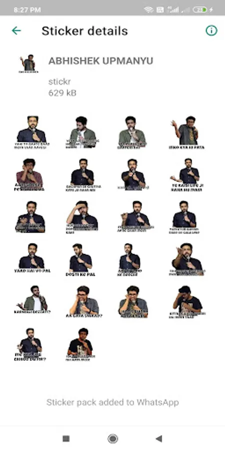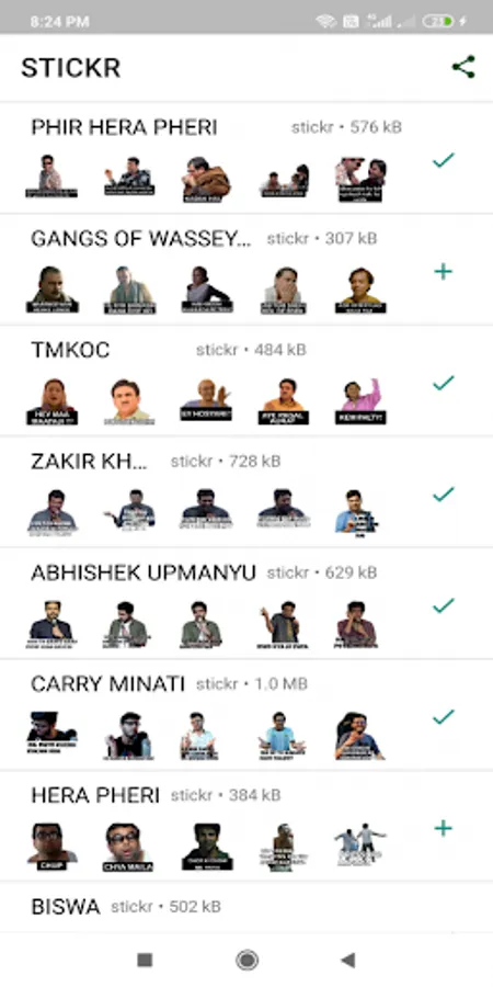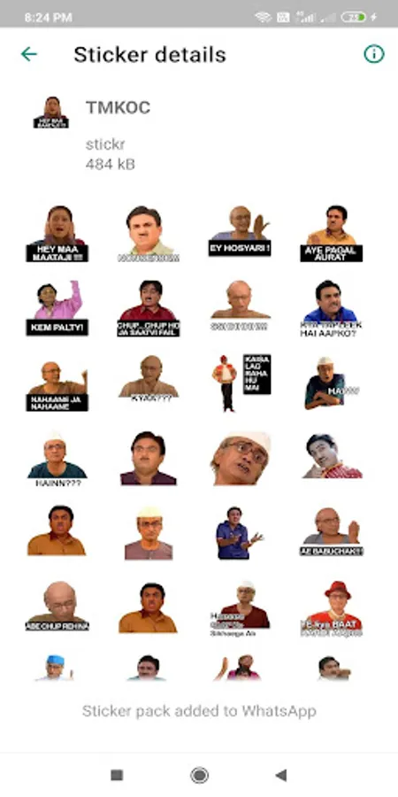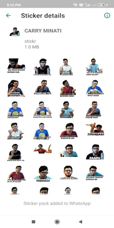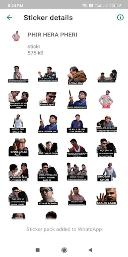 STICKR has 400+ Hindi & English stickers divided into 20+ Categories. These include the popular YouTubers, Stand-up Comedians, Hindi cult movies as well as the trending memes: General memes, Mirzapur, Mirzapur 2, Munna bhaiya, Jethalal , bollywood stickers, Akshay Kumar stickers, Taarak Mehta stickers, Carry Minati, Hindustani Bhau, Zakir Khan, Gangs of Wasseypur, Akash Mehta (Kuch Bhi Mehta), Abhisekh Upmanyu, Anubhav Singh Bassi, Biswa Kalyan Rath, Hera Pheri, Phir Hera Pheri, TMKOC, CID, June 2020's latest, Marathi memes. All the stickers are hand curated by some of the best professionals.