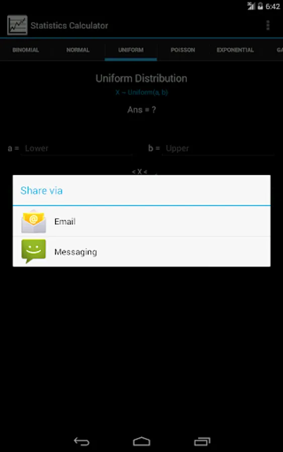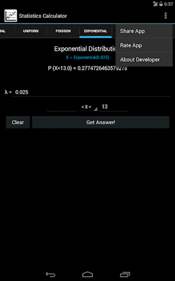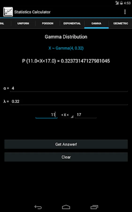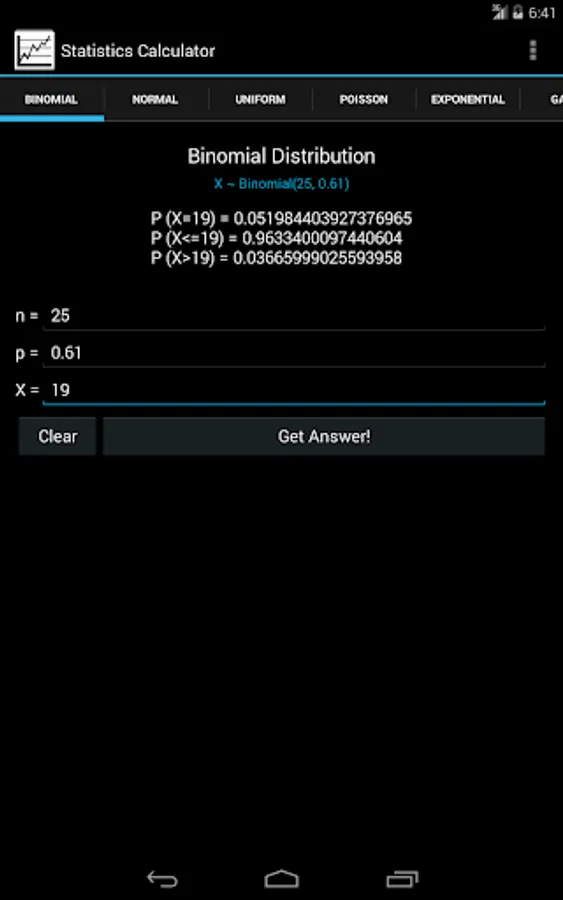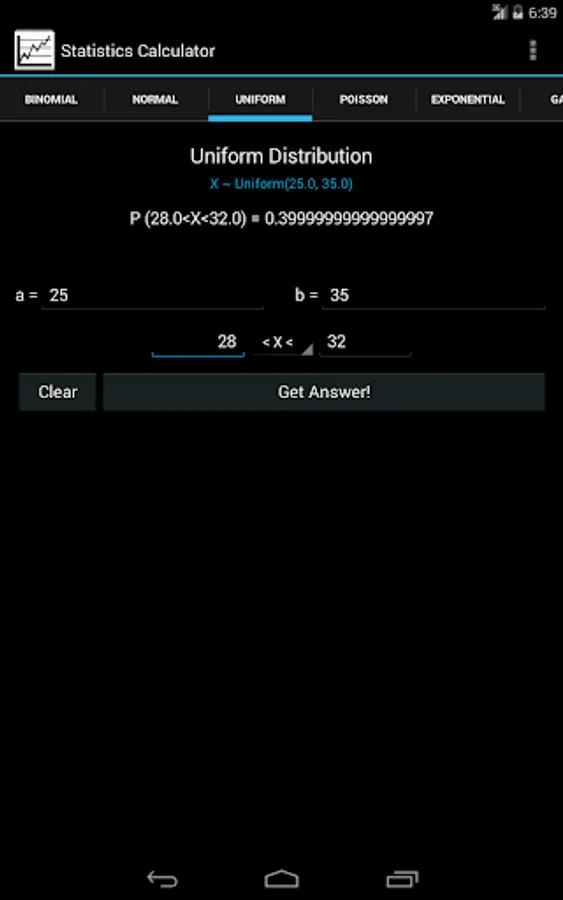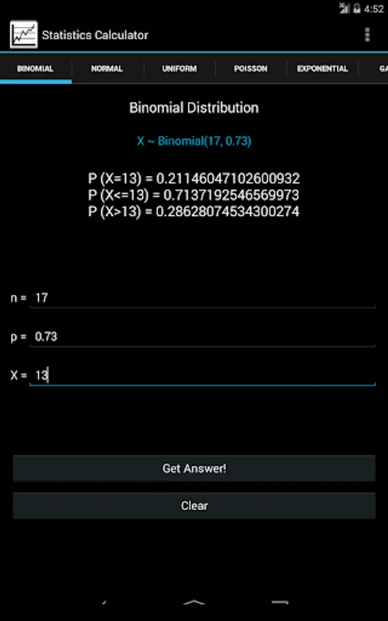Taking a statistics course in high school or university? Then this is the app you'll definitely be wanting to check your answers. With its rich and easy to use user interface Statistics Calculator will help you find probabilities of random variables which follow certain probability distributions.