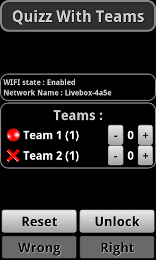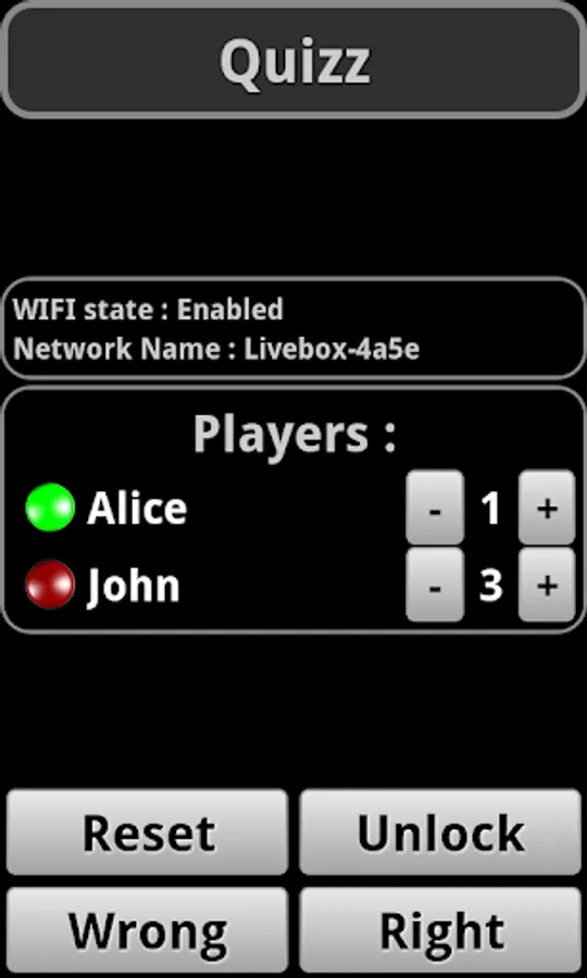 - Wrong : Lock the Buzzer of the player who buzzed and unlock the Buzzers of the other players (This button is available, only if a player buzzed). This feature is there to lock the player who have answered wrong, and let only the other players Buzz and try a new answer.