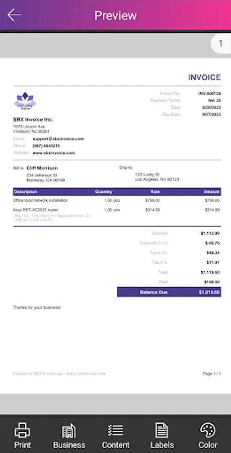 Create invoices quickly and easily. Once the invoice has been completed, you can print it or mail it to your customers. Customize your invoice color, language, header content, and logo.