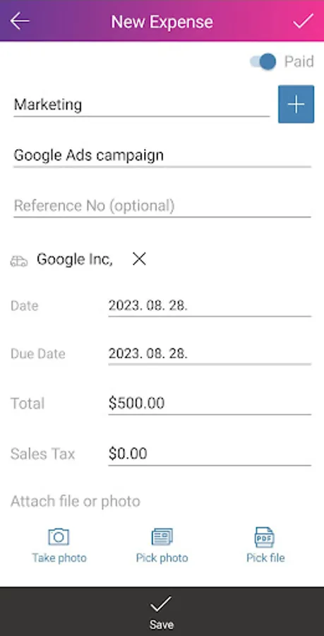 Track and manage your expenses. You can create expense categories for charts and reports.
