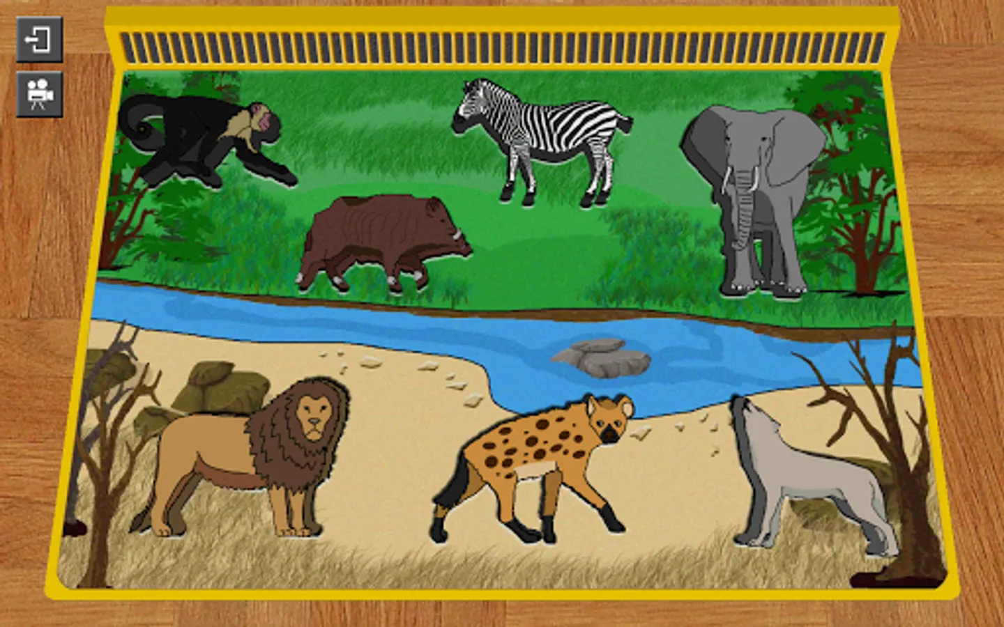 * Monkey, zebra, boar, hyena, lion, elephant, wolf.