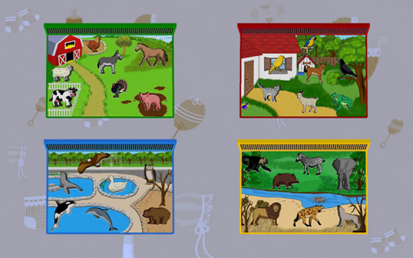 • 4 environments (farm, jungle, zoo, house)