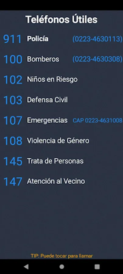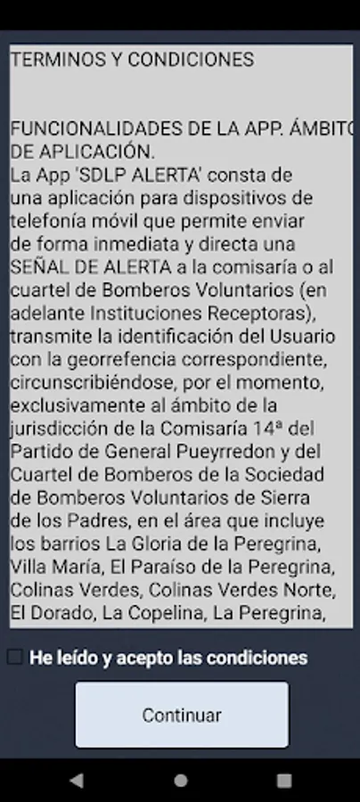 It allows residents of the area to connect directly with the Police Station and with the Sierra de los Padres Fire Station. Sends an alert signal with the user's identification data, also including their current geolocation. It works only after enabling the location (GPS) of your device, granting permission to the app, and if you are within the coverage area.