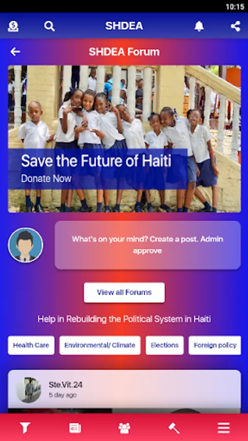 SHDEA Engineer with faith in the power of unity and trust in the Haitian spirit, passion and love for our country, SHDEA seeks to establish a more direct communication line between Haitian people all over the world, as well as create a vital platform where individuals can easily be informed about what is happening in our country particularly, share our opinion and also being able to participating in taking decisions. SHDEA is a non-partisan ecosystem connecting Haitians all over the world with the goal of enhanced mutual understanding and greater empowerment of the general citizenry to truly disrupt the truth and love for this country in need. The app is a platform to lower any real or perceived obstacles for Haitians engagement, participation and will facilitate greater engagement for change in this country that we love.