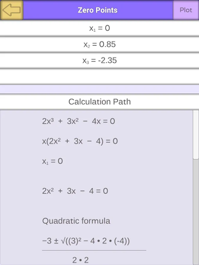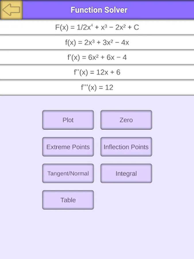 If you need to solve an equation, just use the function solver, which gives you the solution including the calculation pathway for the zero of the function, the extreme points, the point of inflection, tangents, normals, the integral, the first, second and third derivatie and also the anti-derivative.